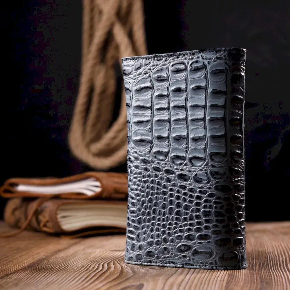 Фактурное женское портмоне из натуральной кожи с тиснением под рептилию, в красивом сером цвете. Изделие состоит из двух автономных отделений, которые закрываются клапанами на кнопку. Внутри представлено множество карманов, в которых можно удобно разложить купюры, пластиковые карточки и документы. Такой кошелек из натуральной кожи - это идеальный вариант на каждый день для тех, кто ценит качество, удобство и комфорт, а также будет отлично дополнять Ваш повседневный образ.