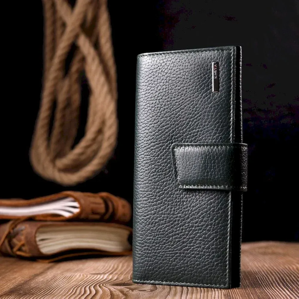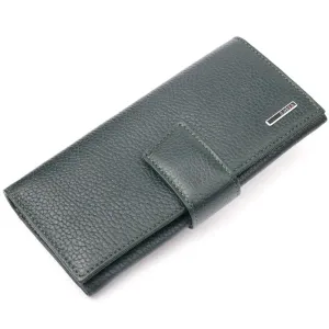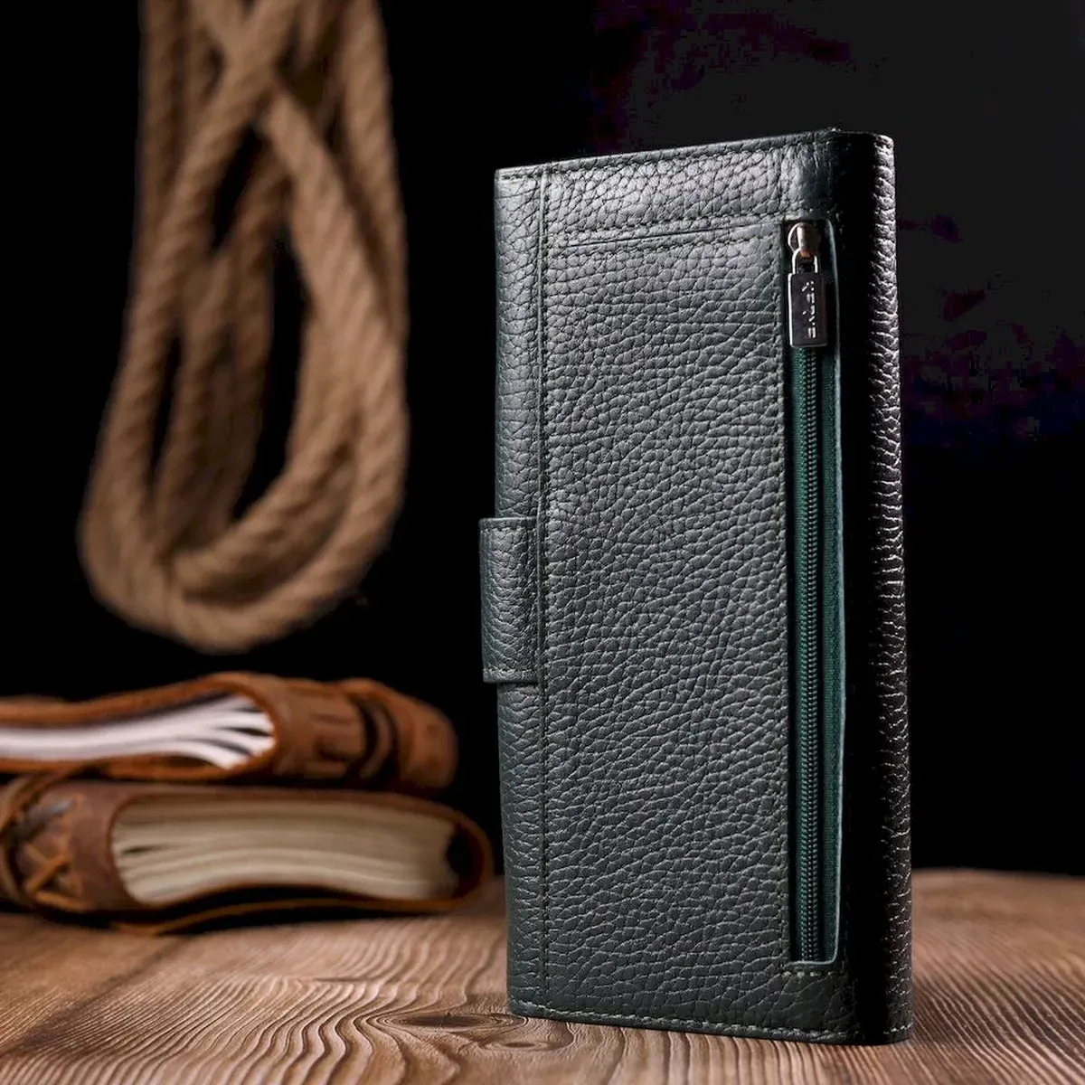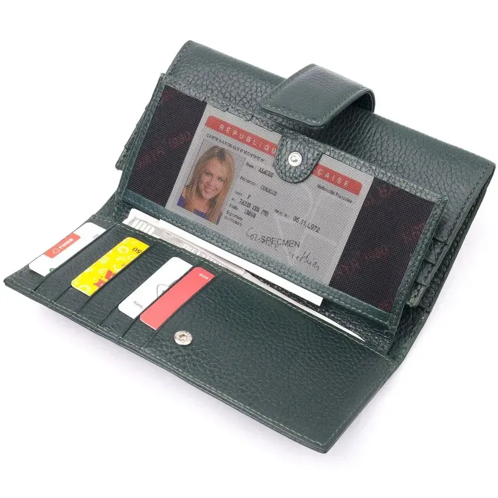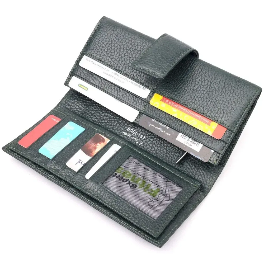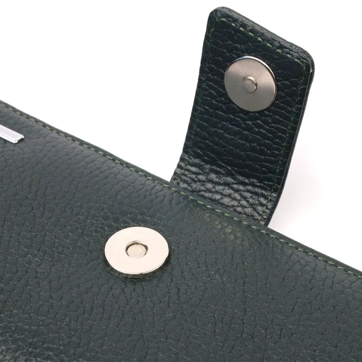 Стильный женский кошелек из натуральной зернистой кожи, в зеленом цвете. Складывается аксессуар пополам, с фиксацией на хлястик и магнит. Особенностью данного аксессуара есть наличие блока для кредитных карточек, что закрывается на кнопку. Качественная фурнитура дополняет и украшает изделие. Такой кошелек из натуральной кожи - это идеальный вариант на каждый день для тех, кто ценит качество, удобство и комфорт, а также будет отлично дополнять Ваш повседневный образ.