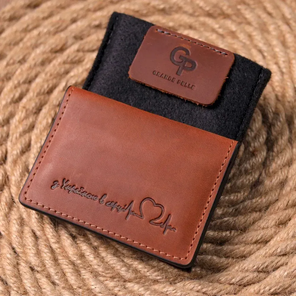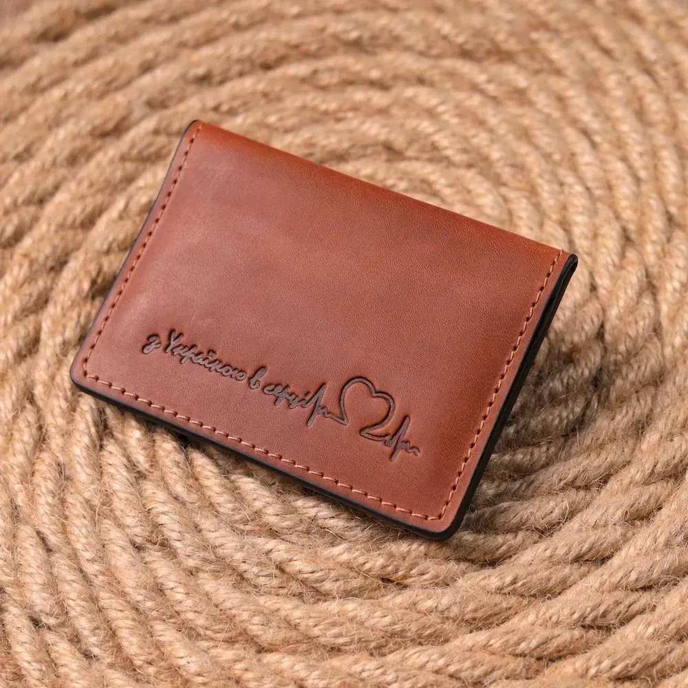 Стильная кожаная обложка на авто документы, для настоящего патриота с надписью “ З Україною в серці” на лицевой стороне. Изделие пошито с итальянской качественной кожи. По краям модель прошита коричневой строчкой в дизайн изделия. Изделие небольшого размера и с легкостью поместится в карман или маленькую сумку. В комплекте к изделию идет фирменный фетровый чехол.