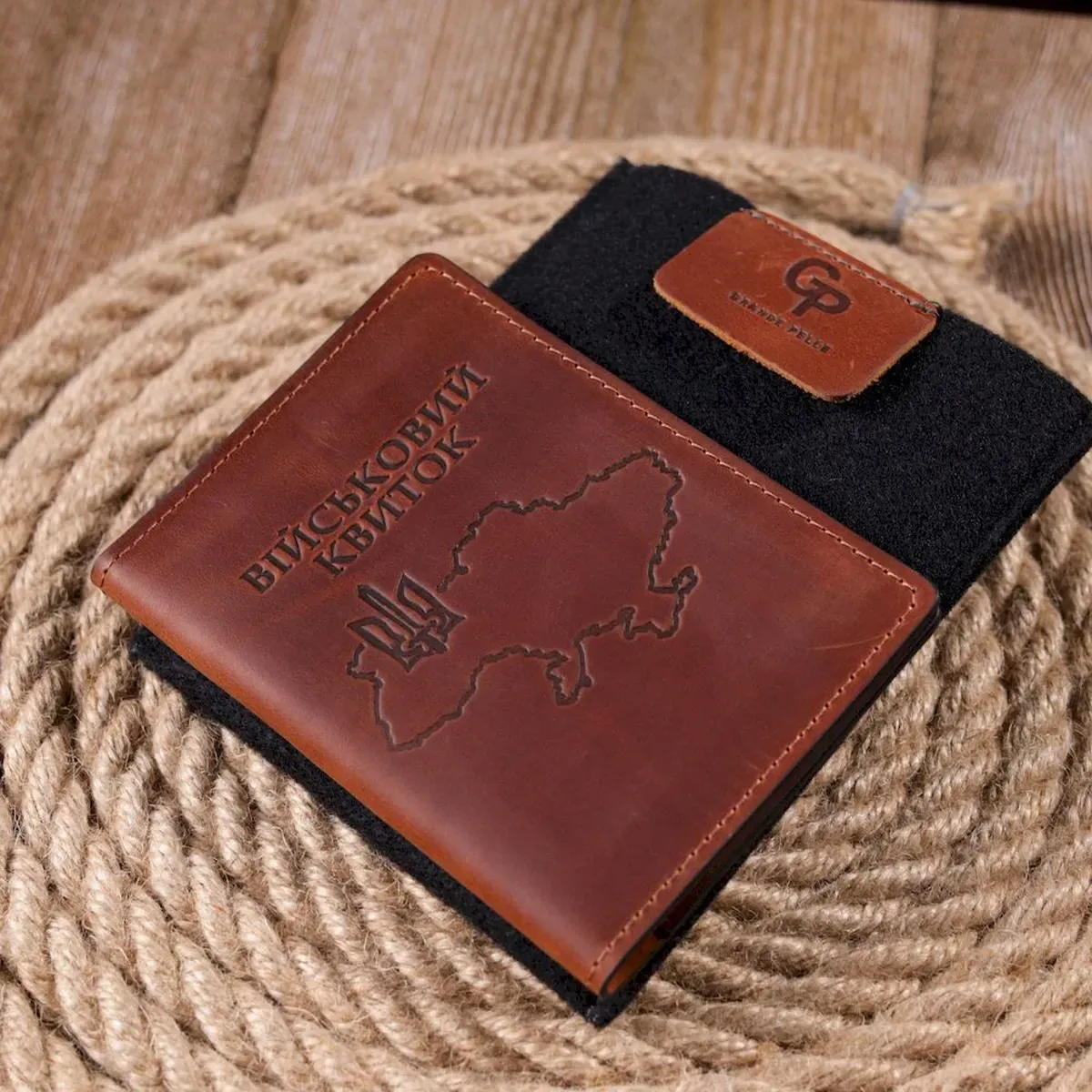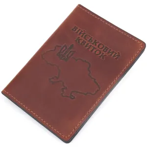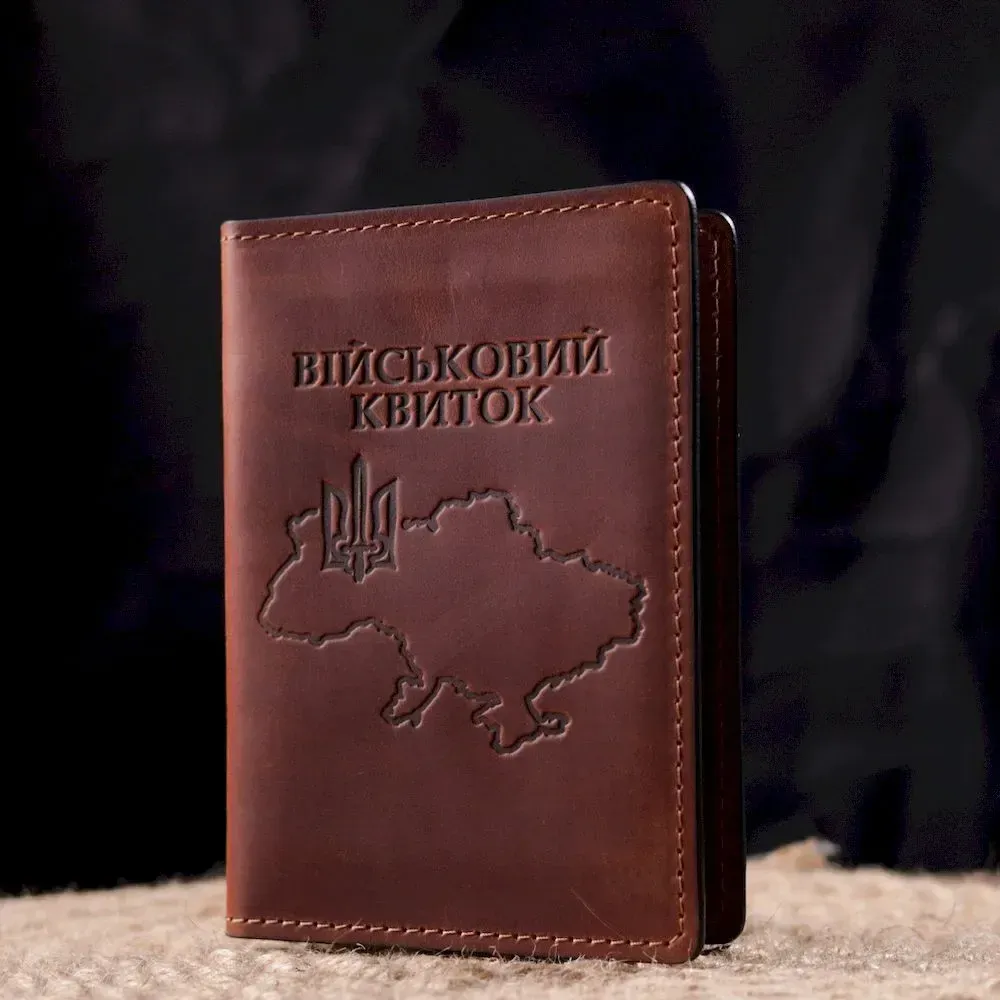 Многофункциональная обложка светло-коричневого цвета для военного билета с патриотическим тиснением карты Украины, на лицевой стороне. Изделие пошито с качественной винтажной итальянской кожи с высоким показателем износостойкости, которая защитит от повреждений документ на очень долгое время. Аксессуар имеет разворот для военного билета, две ячейки для карточек, без застежки, упакован в фирменный чехол.