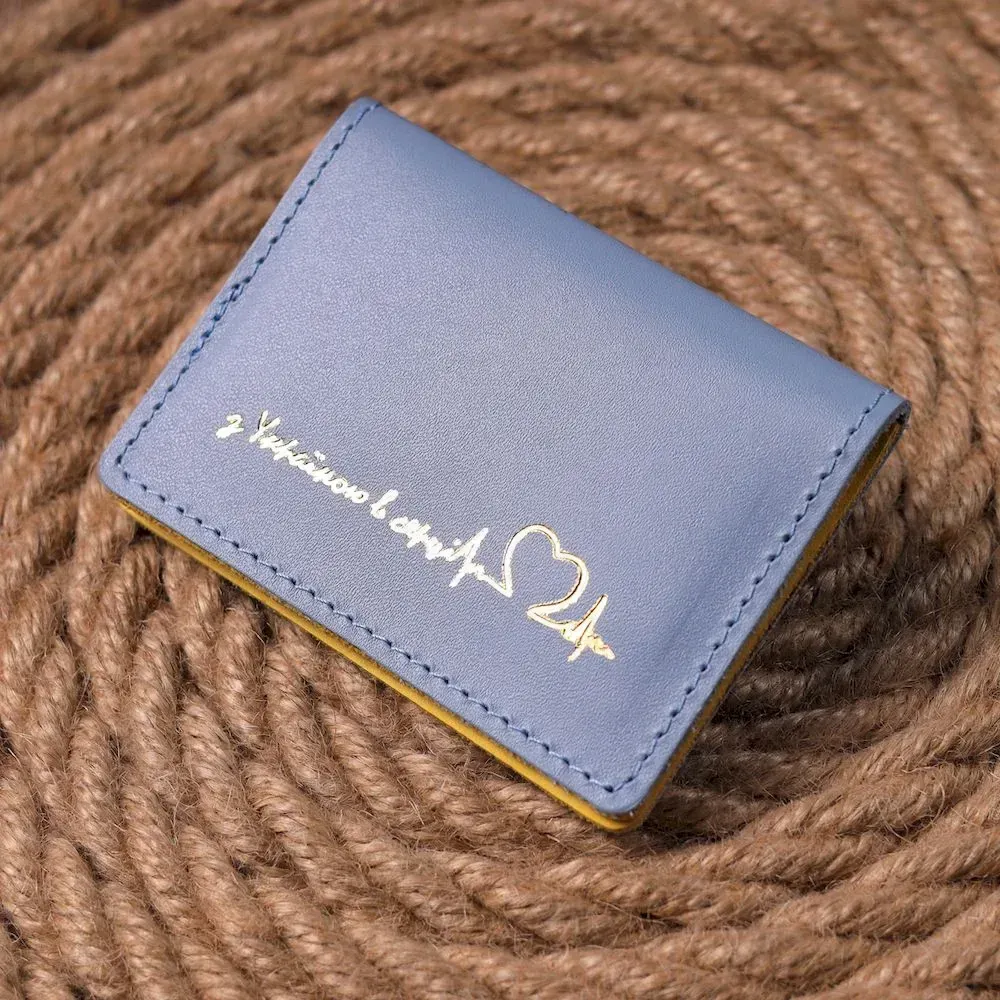 Патриотичная кожаная обложка на авто документы в комбинации двух цветов, желтого и голубого, с золотистой надписью “ З Україною в серці” на лицевой стороне. Изделие пошито с итальянской качественной кожи. Модель небольшого размера и с легкостью поместится в карман или маленькую сумку. В комплекте к изделию идет фирменный фетровый чехол.