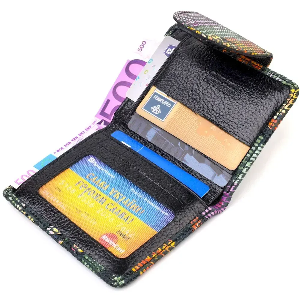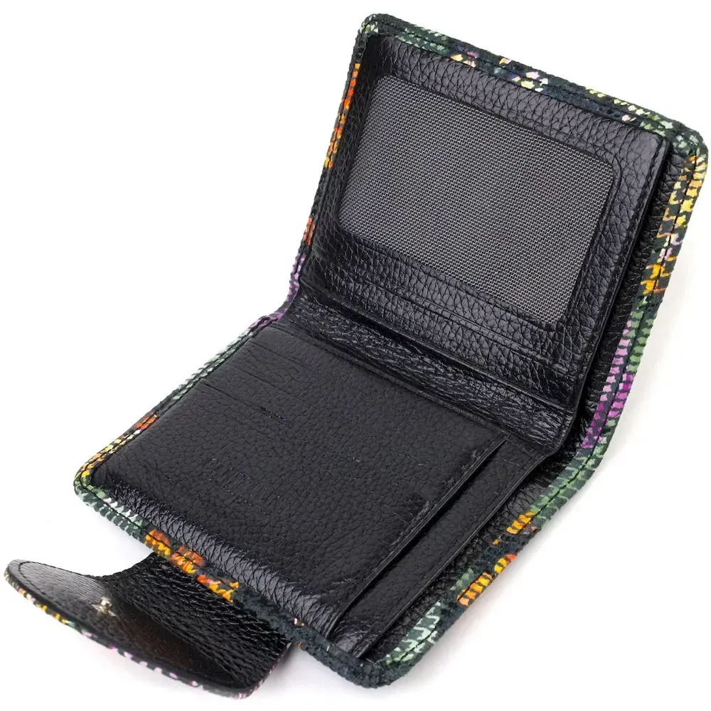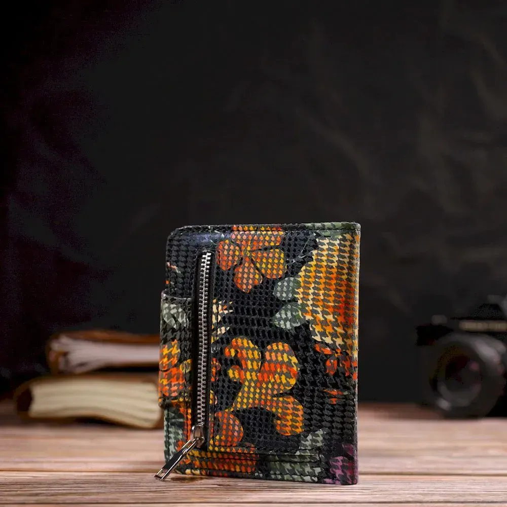 Женский фактурный кошелек из натуральной кожи, изделие имеет красочный цветочный принт снаружи и чисто черный внутри. Аксессуар состоит из одного основного отделения с тканевой перегородкой в которое помещаются купюры всех номиналов, четырех карманов для карточек (один под сеточкой), трех скрытых кармана и монетницы. Закрывается аксессуар пополам хлястиком на кнопку. Приобретая кожаный аксессуар этой фирмы, себе или на подарок, будьте уверены, что он прослужит Вам не один год.