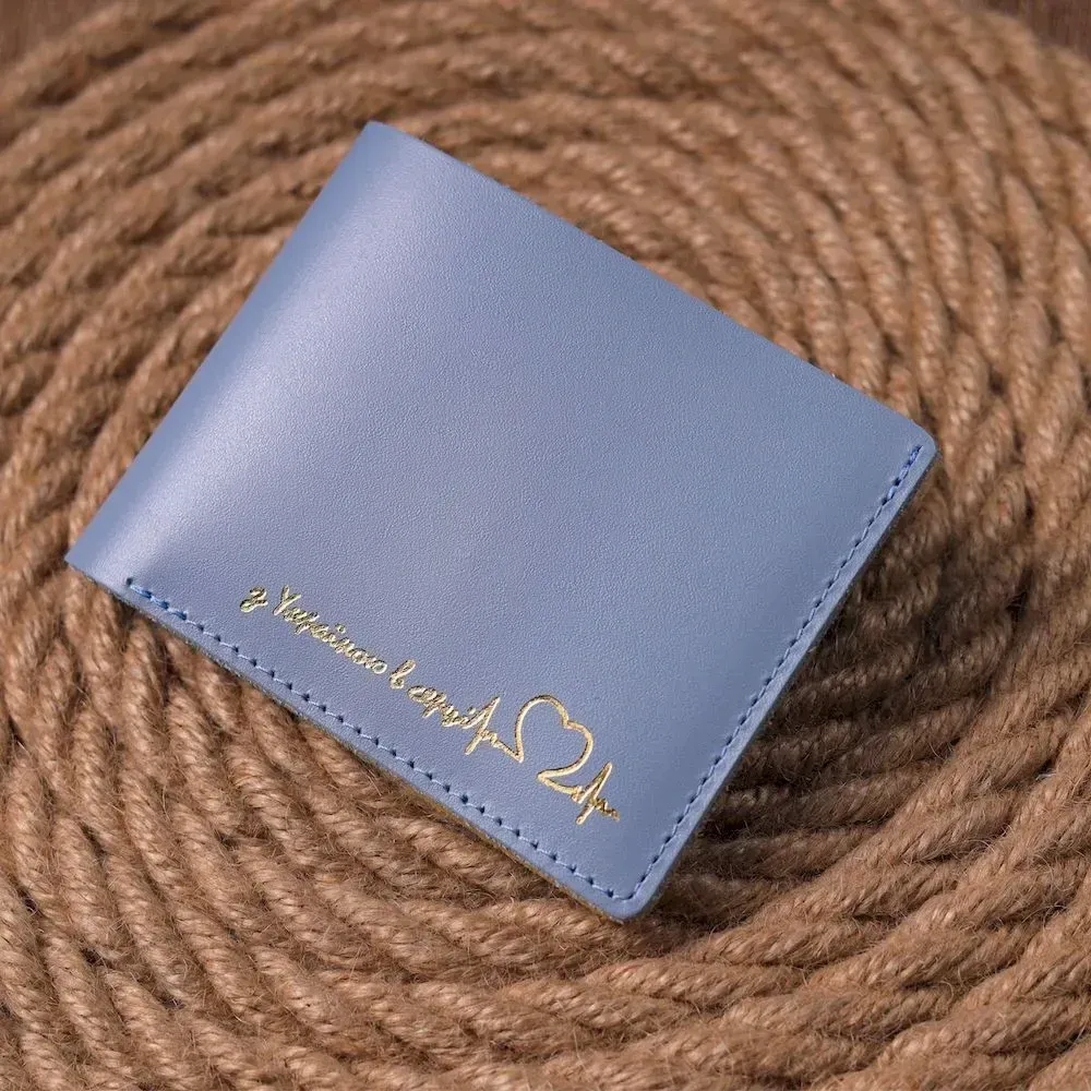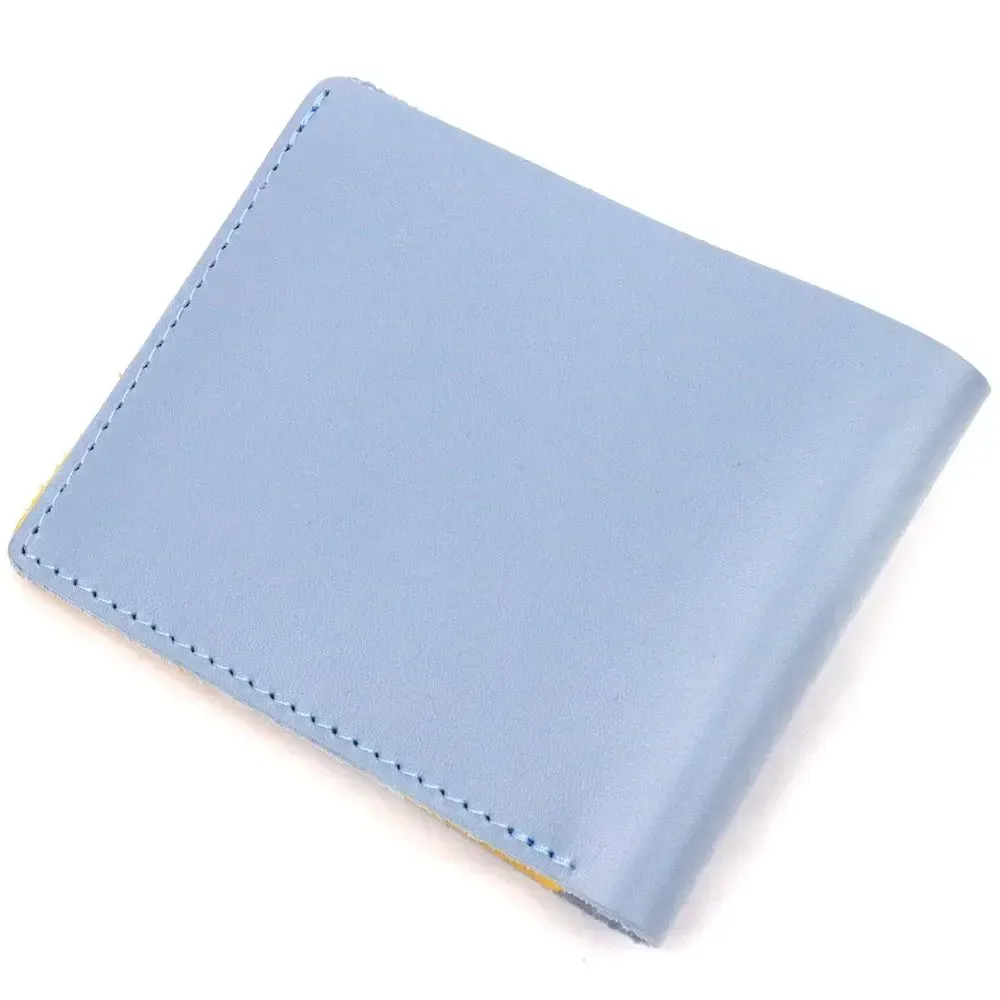 Стильный кожанный кошелек , в комбинации двух цветов голубого снаружи и желтого внутри c патриотической надписью “З Україною в сердці”. Изделие пошито из качественной кожи, с високими показателями износостойкости . Портмоне имеет одно большое отделение для купюр всех номиналов, а также достаточное количество отделений для карт, без застежки. Кожаный кошелек станет отличным подарком на все случаи жизни.