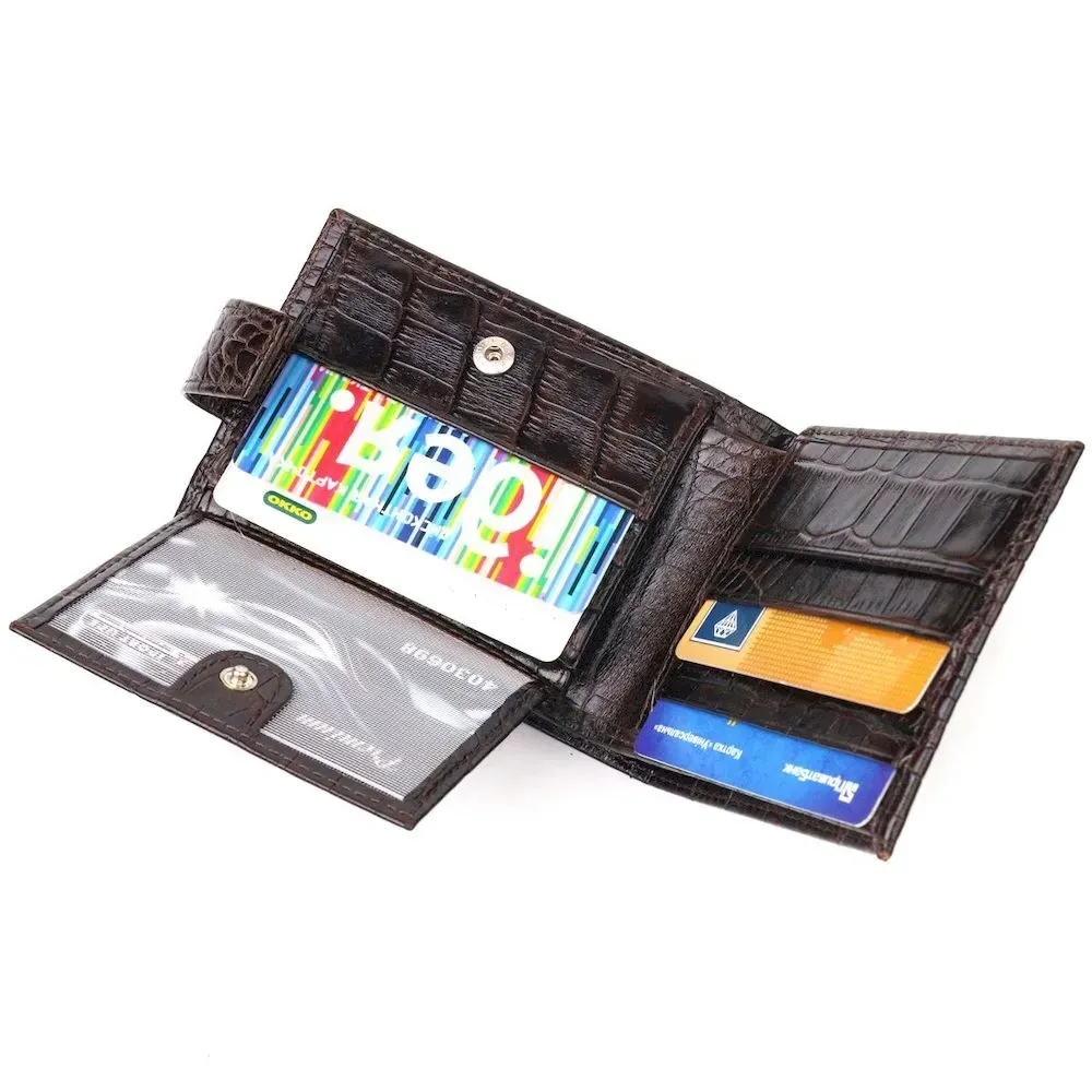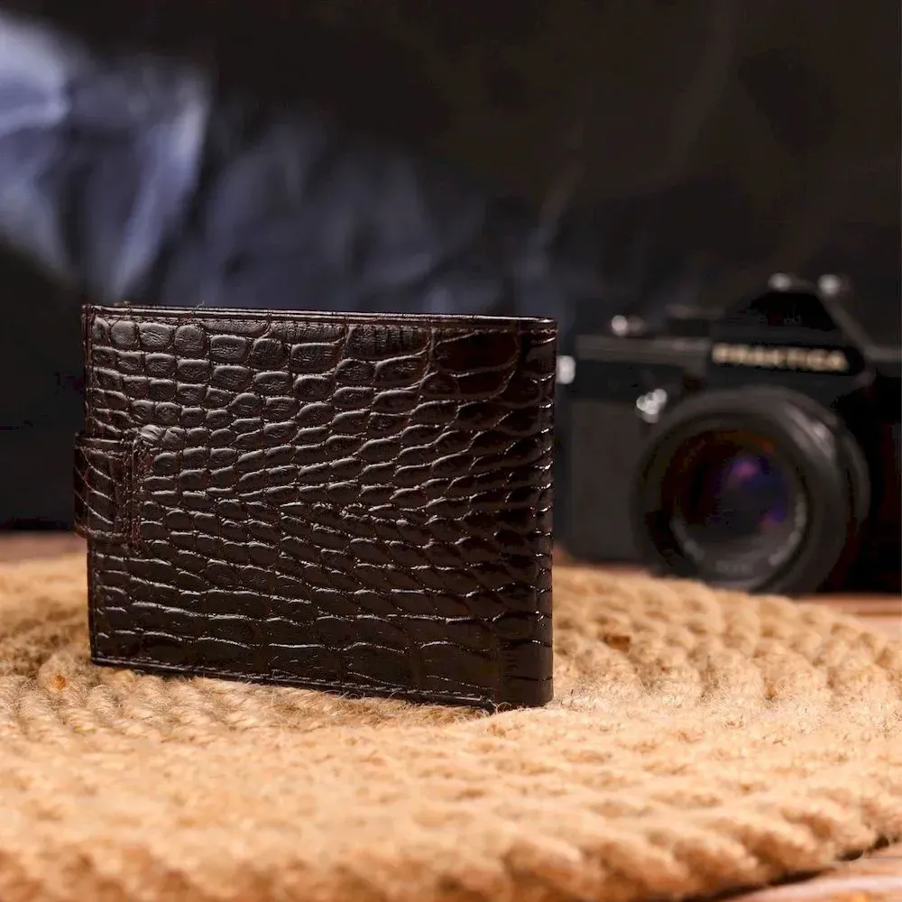 Оригинальный мужской кошелек, из натуральной фактурной кожи, с тиснением под крокодила. Аксессуар имеет одно основное отделение с перегородкой, в которое помещаются купюры всех номиналов, девять карманов для карточек, два из которых под сеточкой, монетница и два прилегающих кармана. Закрывается аксессуар хлястиком на кнопку. Цвет фурнитуры – серебро. Вы легко сможете поместить его в карман брюк или маленькую сумку. Упакован бумажник картонную коробку. Кожаный кошелек является отменным подарком для родных и близких людей.