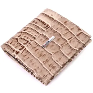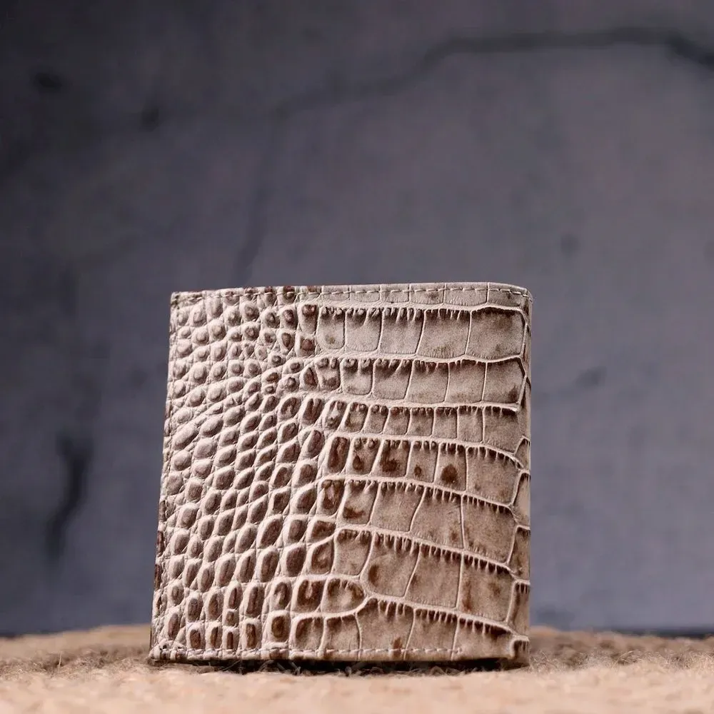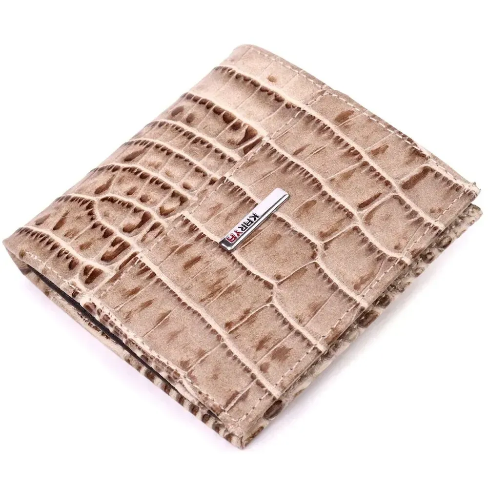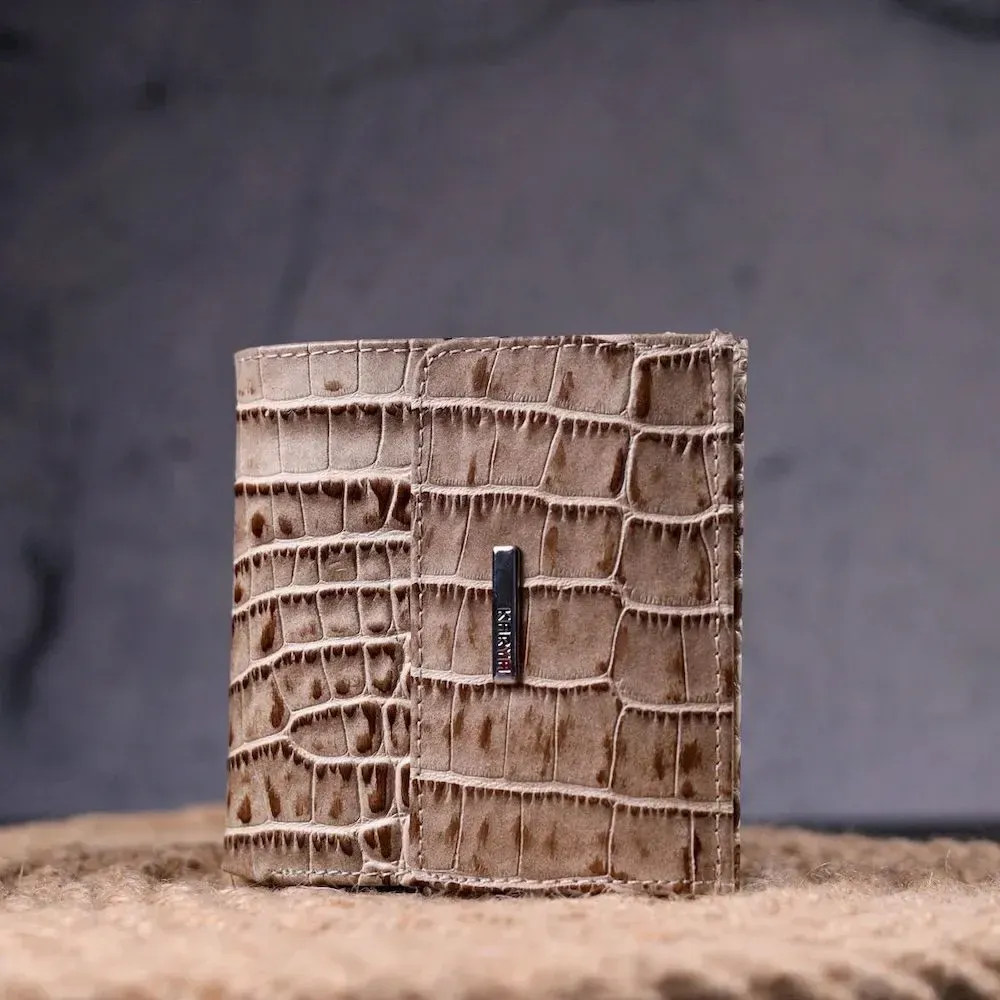 Небольшой женский кошелек из натуральной фактурной кожи с тиснением под крокодила. Внутри есть отделение для купюр и три ячейки для кредитных карт. В изделии использована качественная фурнитура, а также прочная фирменная подкладка. Небольшой кожаный кошелек поместится даже в самую маленькую сумочку. Закрывается модель в два сложения на кнопку. Такой кошелек, однозначно, порадует любую женщину.