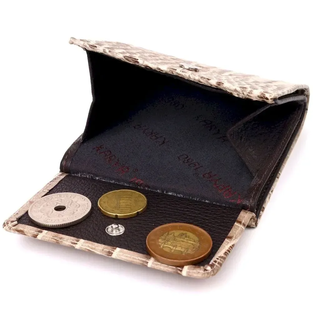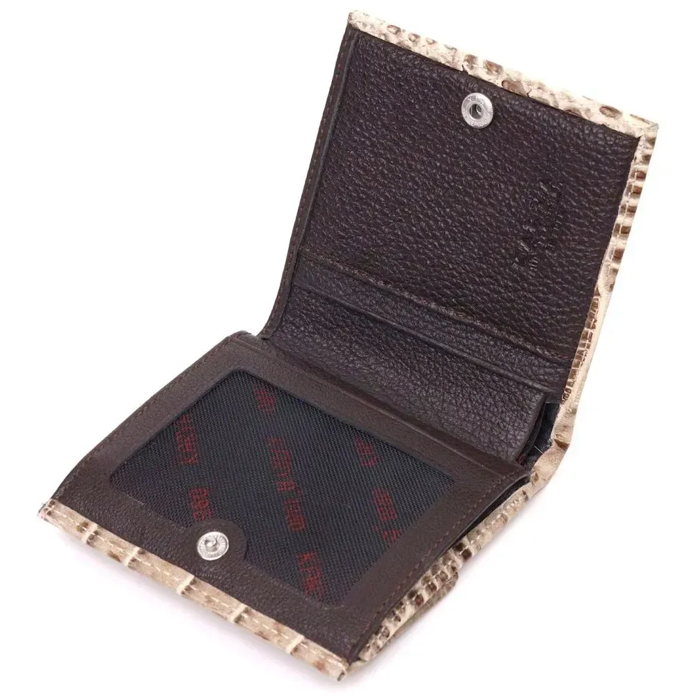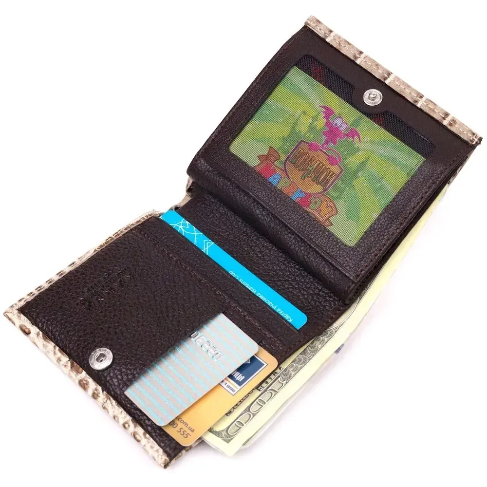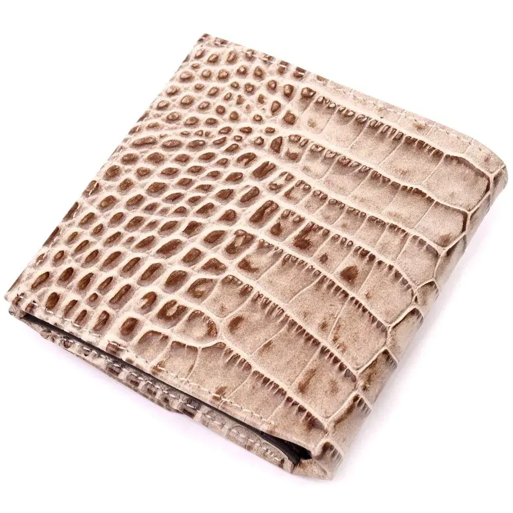 Небольшой женский кошелек из натуральной фактурной кожи с тиснением под крокодила. Внутри есть отделение для купюр и три ячейки для кредитных карт. В изделии использована качественная фурнитура, а также прочная фирменная подкладка. Небольшой кожаный кошелек поместится даже в самую маленькую сумочку. Закрывается модель в два сложения на кнопку. Такой кошелек, однозначно, порадует любую женщину.