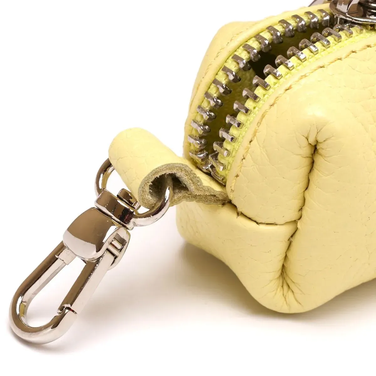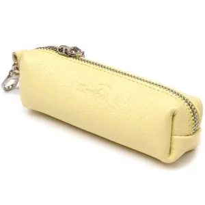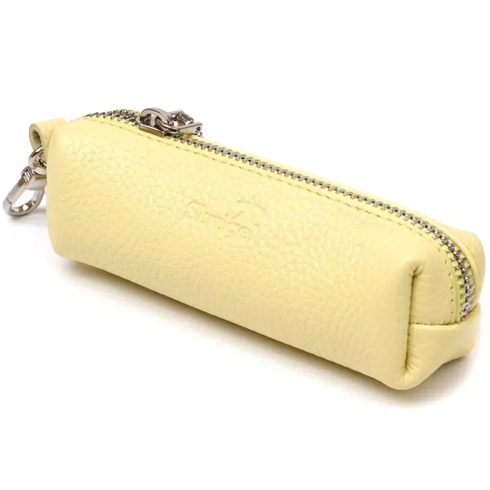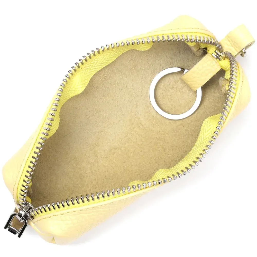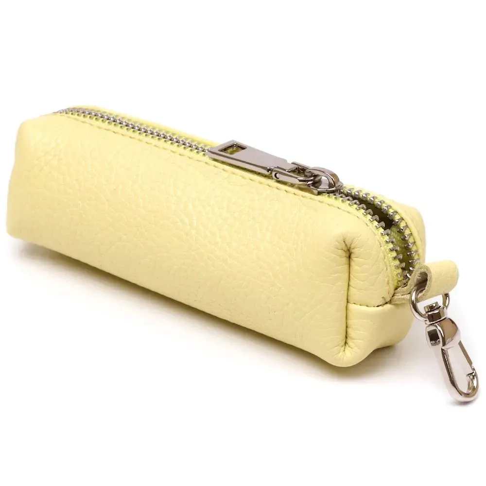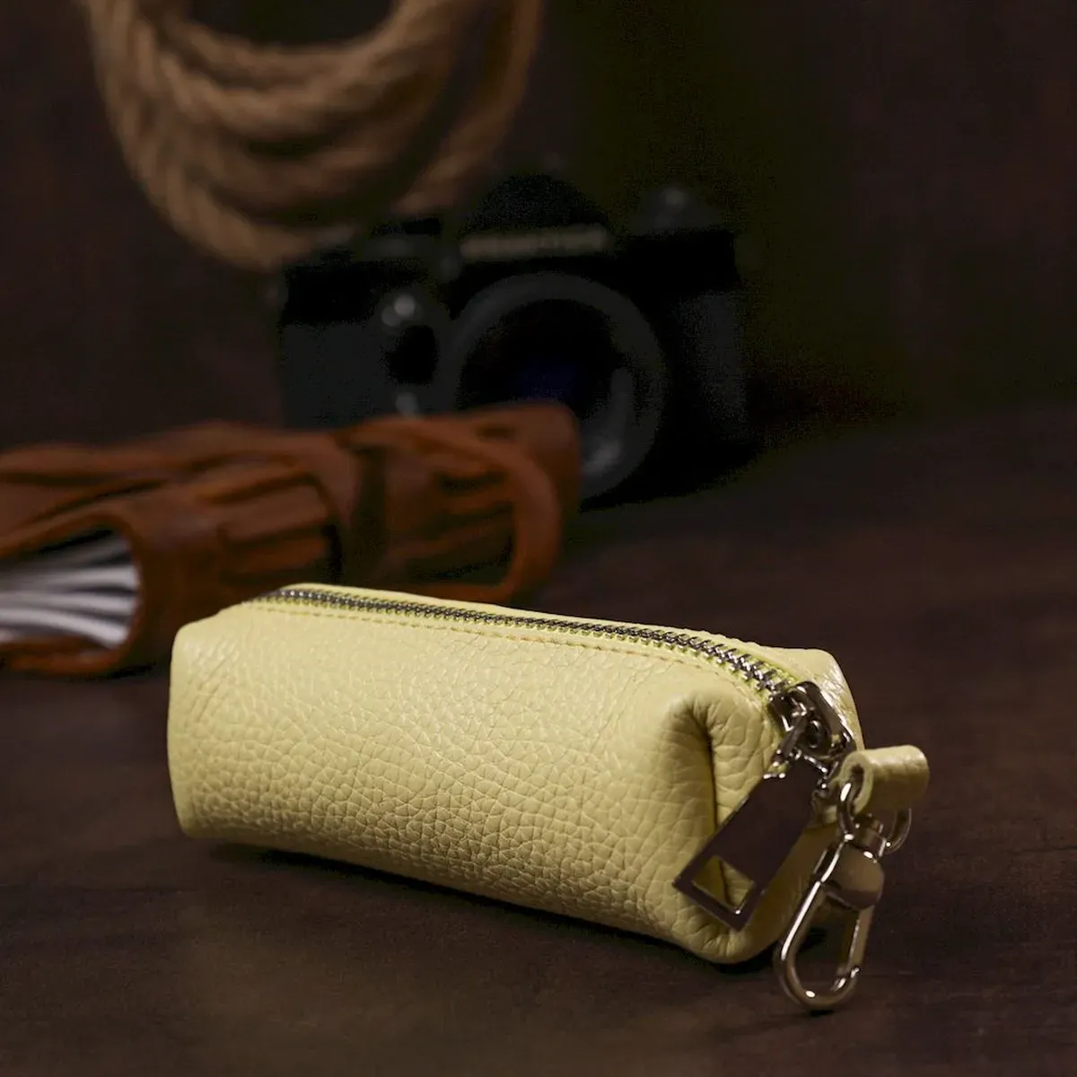 Красивая стильная ключница в интересном лимонном цвете, смотрится очень свежо и необычно. Материал изготовления – качественная кожа с улучшенными показателями стойкости к износу. Имеет зернистую мягкую фактуру. Внутри есть металлическое кольцо для крепления ключей, на внешней стороне специальный карабин.