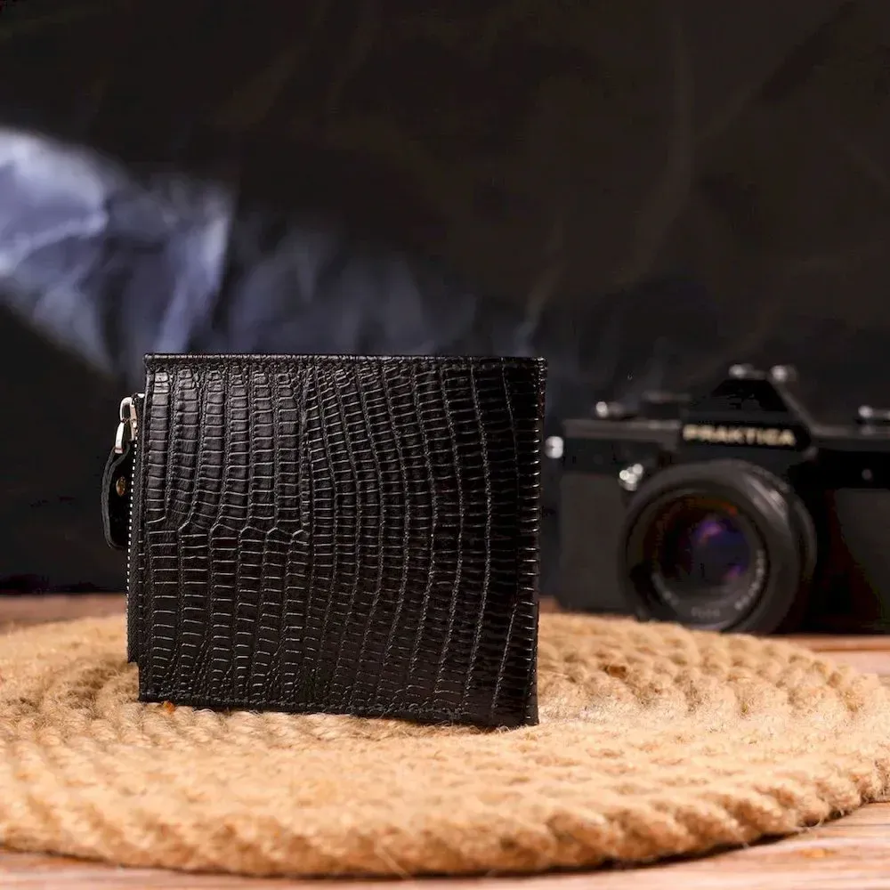 Надежное портмоне для мужчин, из натуральной фактурной кожи, в классическом черном цвете. Аксессуар имеет одно основное отделение с перегородкой, в которое помещаются купюры всех номиналов, девять карманов для карточек, два из которых под сеточкой, монетницу на молнии, пять прилегающих карманов, а также автономный блок для карт, который расположен в одном из прилегающих карманов. Закрывается аксессуар хлястиком на кнопку. Цвет фурнитуры – серебро. Кожаный кошелек является отменным подарком для родных и близких людей.