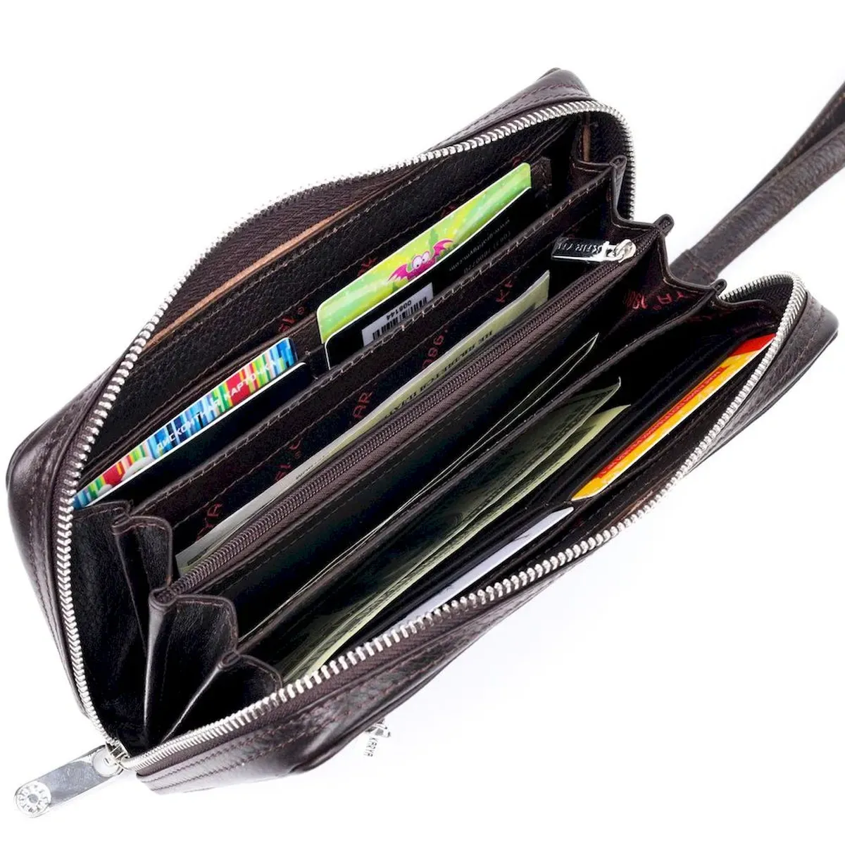 - внутри: карман-перегородка на молнии, шесть открытых карманов, 12 слотов для кредитных карт;