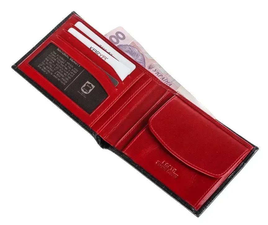 Необычный мужской кошелек, из натуральной фактурной кожи, под рептилию. Внутренняя отделка аксессуара - сочетание прочного текстиля и красной гладкой кожи, что делает аксессуар оригинальным и очень стильным.
