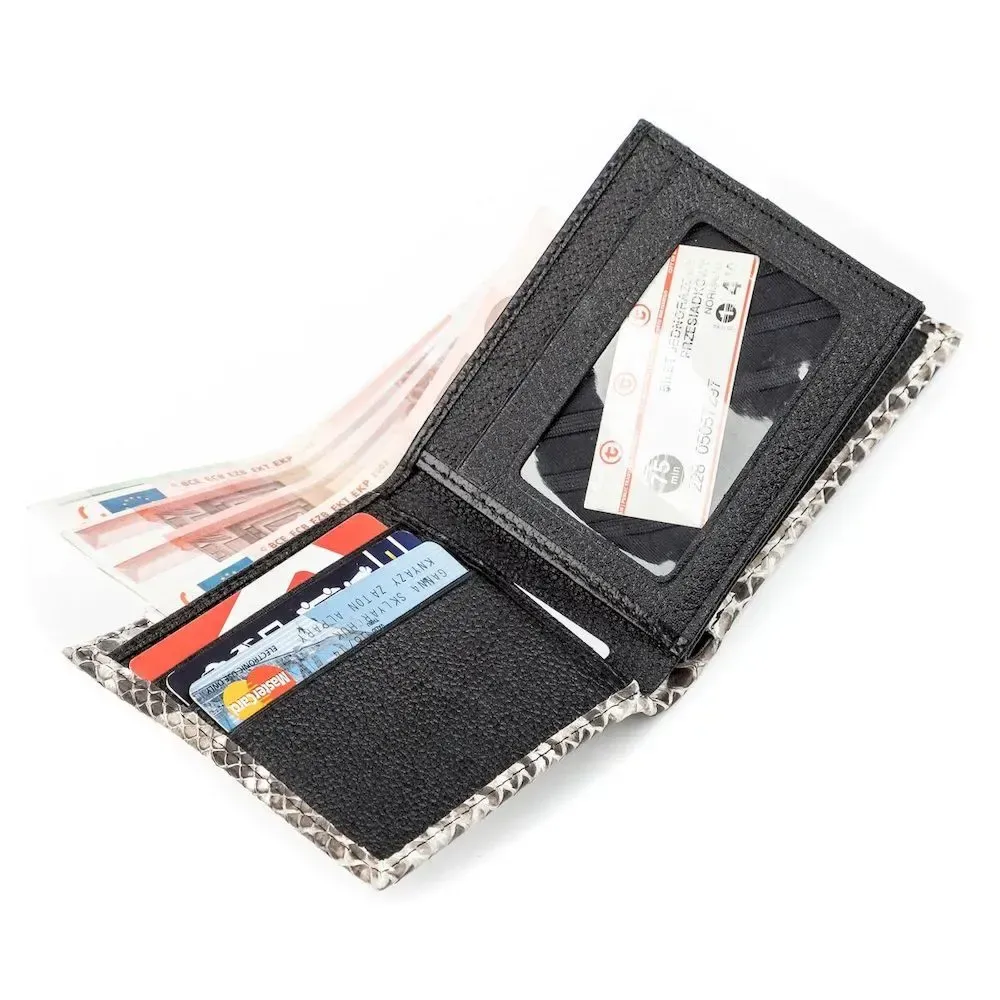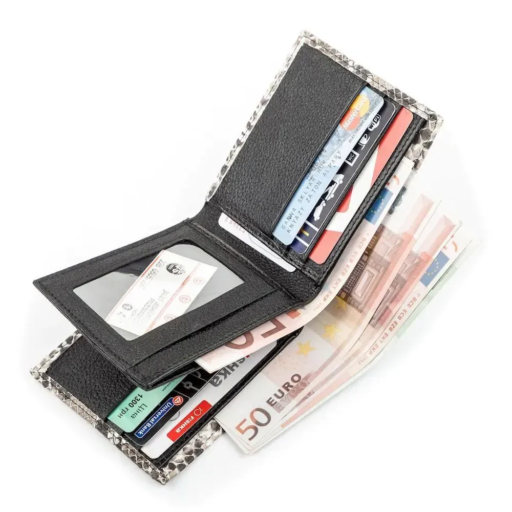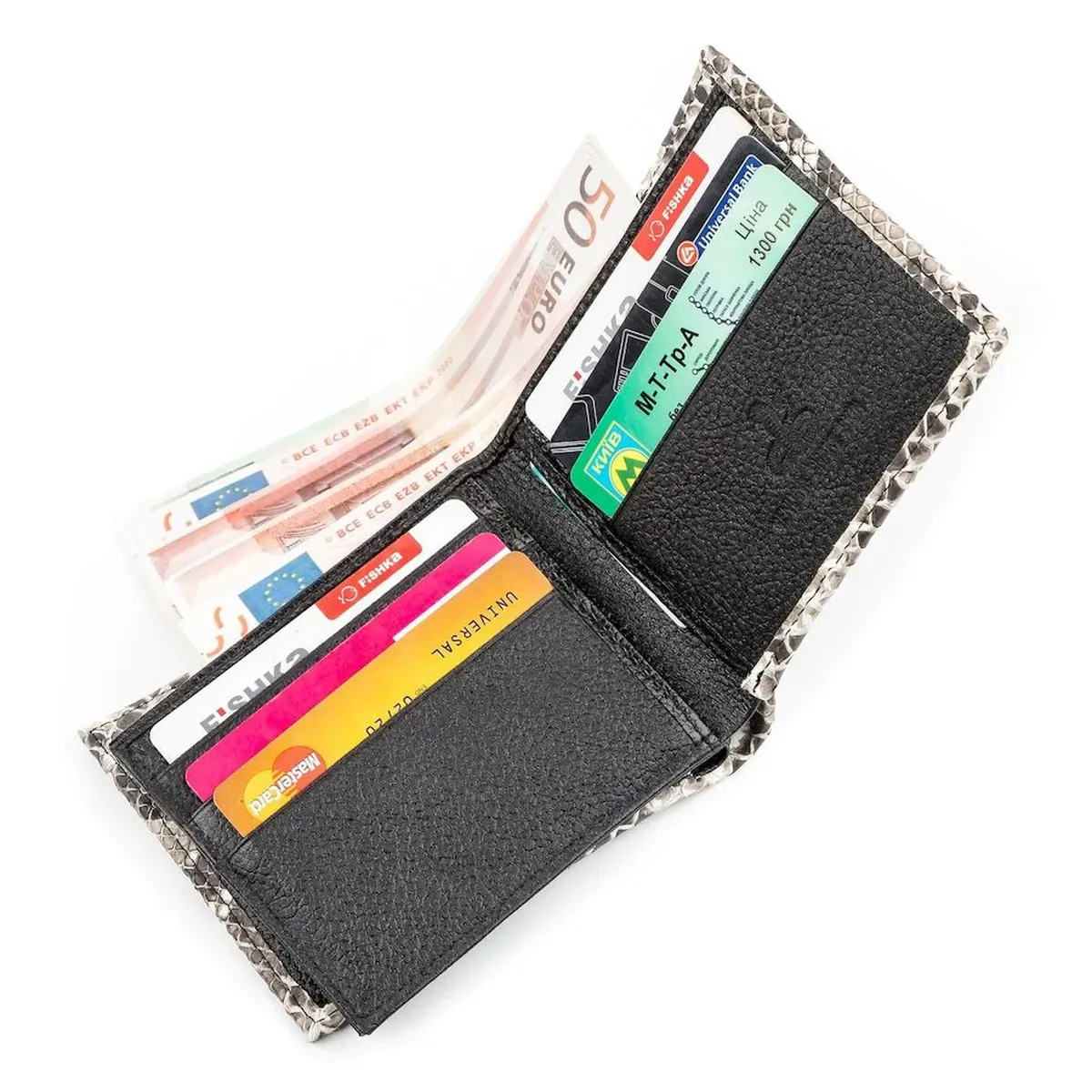 Красивый кошелек из натуральной кожи питона, которая обладает фантастической фактурой и красотой. Натуральная кожа питона довольно мягкая и гладкая, приятная на ощупь, она известна своей эластичностью и прекрасными изоляционными свойствами, также характерным признаком натуральной кожи есть наличие чешуек. Нередко крупные чешуйки могут отгибаться, создавая хаотичный «рисунок».