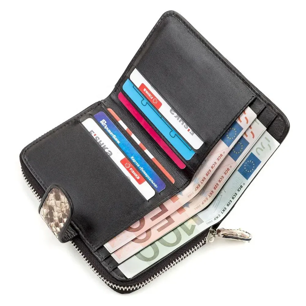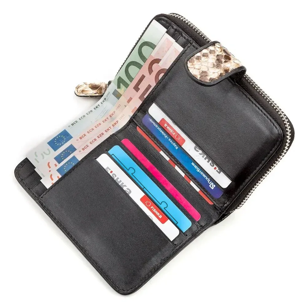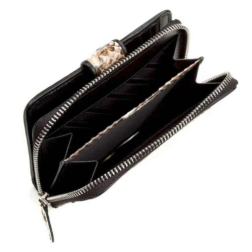 Изысканный кошелек из натуральной кожи питона, которая обладает фантастической фактурой и красотой. Натуральная кожа питона довольно мягкая и гладкая, приятная на ощупь, она известна своей эластичностью и прекрасными изоляционными свойствами, также характерным признаком натуральной кожи есть наличие чешуек. Нередко крупные чешуйки могут отгибаться, создавая хаотичный «рисунок».