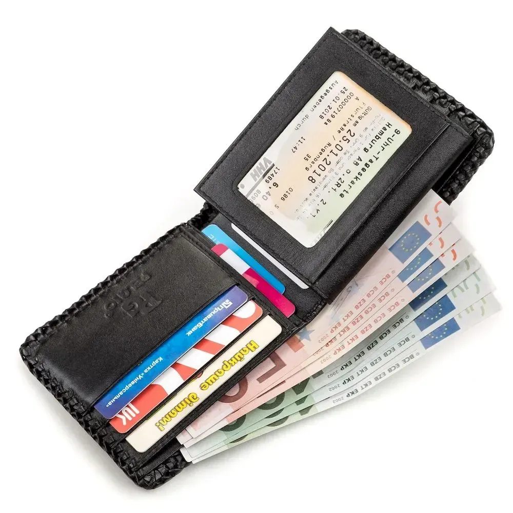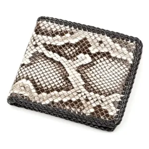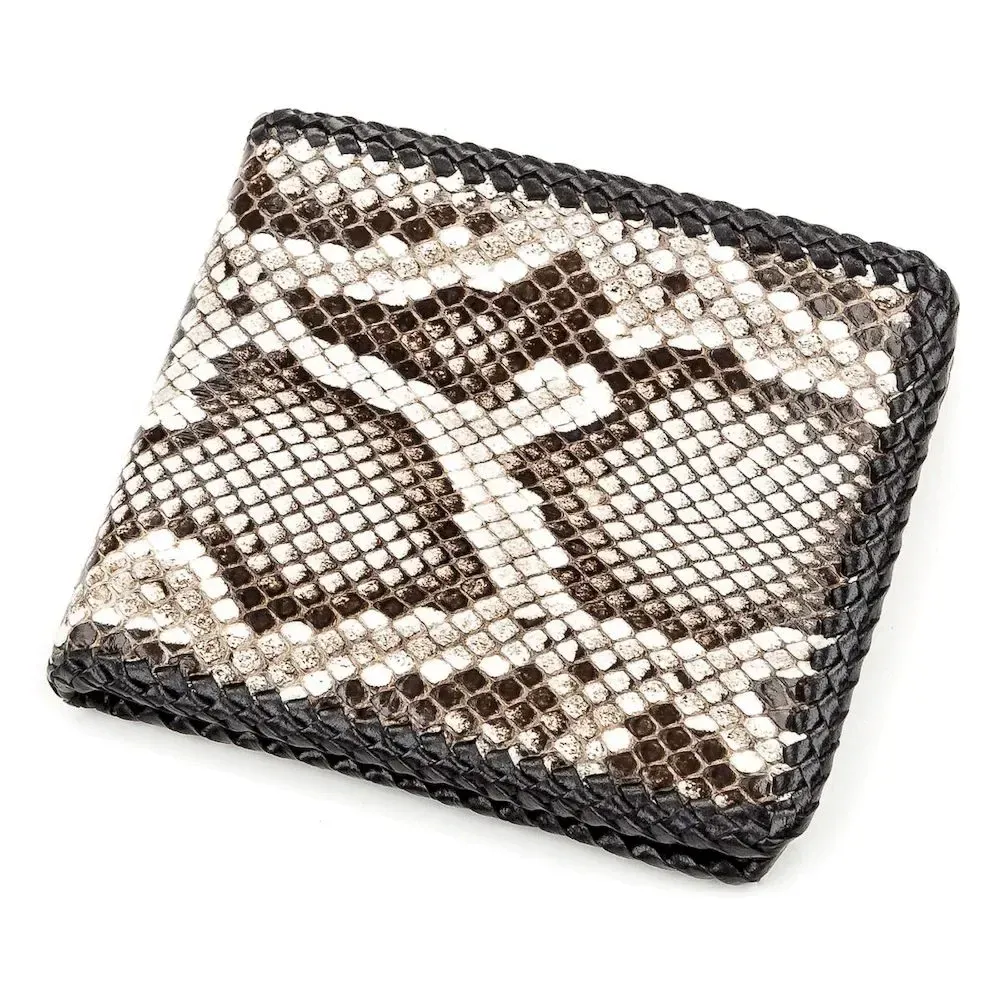 Изысканный кошелек из натуральной кожи питона, которая обладает фантастической фактурой и красотой. В качестве дополнительной отделки по внешнему краю аксессуара сделана оплетка из гладкой черной кожи. Натуральная кожа питона довольно мягкая и гладкая, приятная на ощупь, она известна своей эластичностью и прекрасными изоляционными свойствами, также характерным признаком натуральной кожи есть наличие чешуек. Нередко крупные чешуйки могут отгибаться, создавая хаотичный «рисунок».