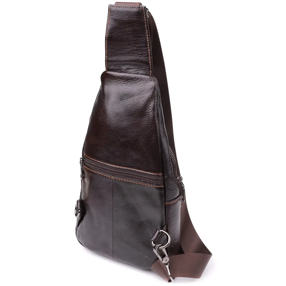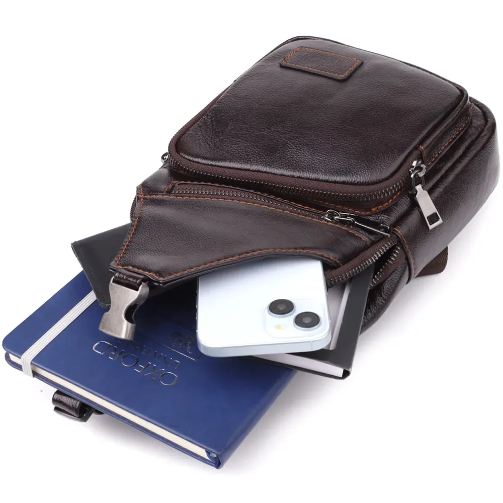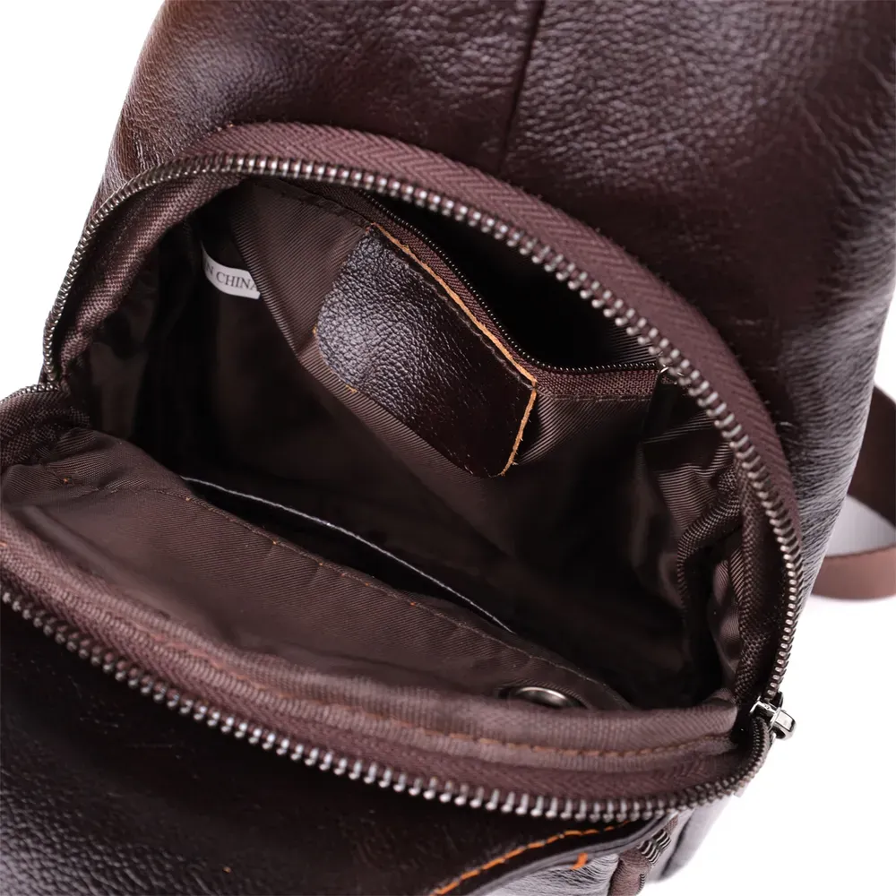Стильна чоловіча шкіряна сумка через плече відрізняється продуманим дизайном та функціональністю. Одне основне відділення на блискавці забезпечує надійне зберігання речей. Усередині розташовані дві кишені — одна на блискавці для цінних предметів і одна відкритого типу для швидкого доступу.