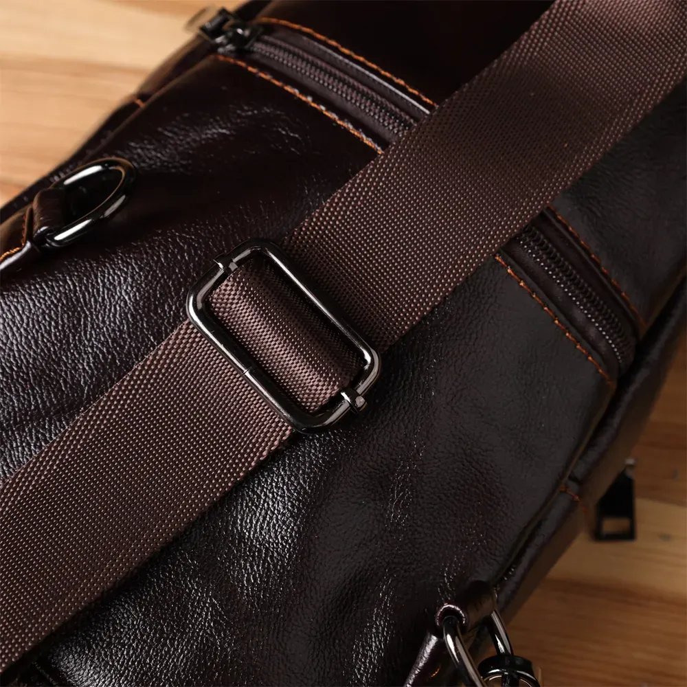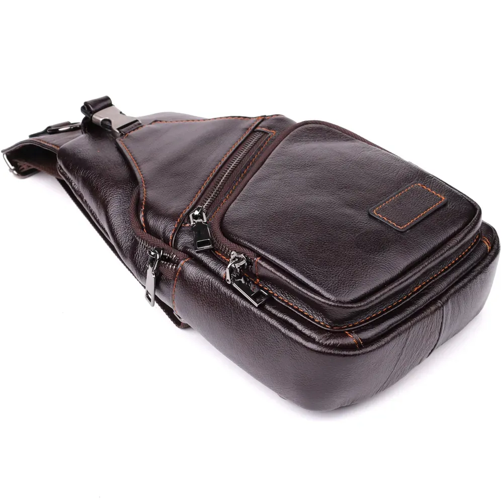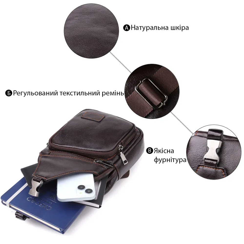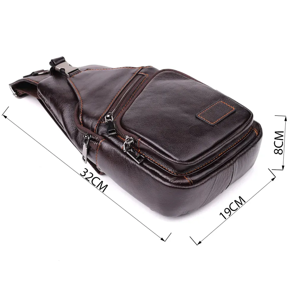 Стильна чоловіча шкіряна сумка через плече відрізняється продуманим дизайном та функціональністю. Одне основне відділення на блискавці забезпечує надійне зберігання речей. Усередині розташовані дві кишені — одна на блискавці для цінних предметів і одна відкритого типу для швидкого доступу.