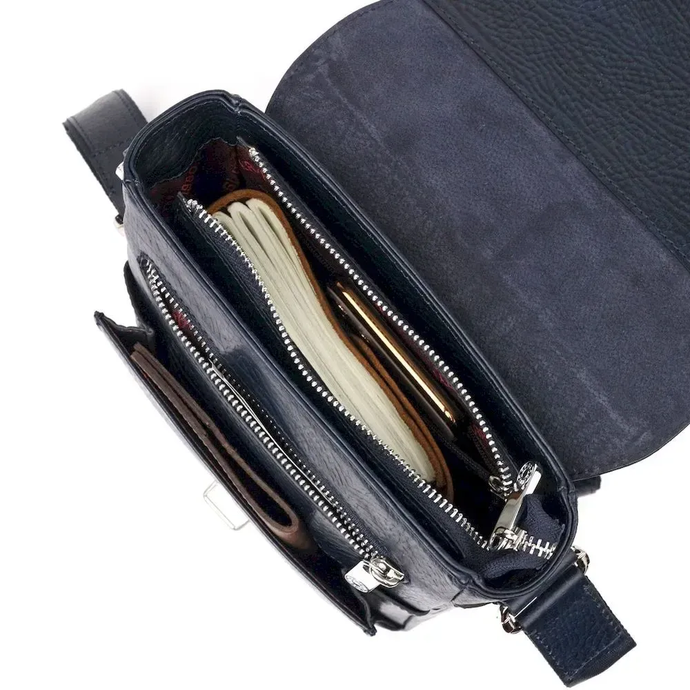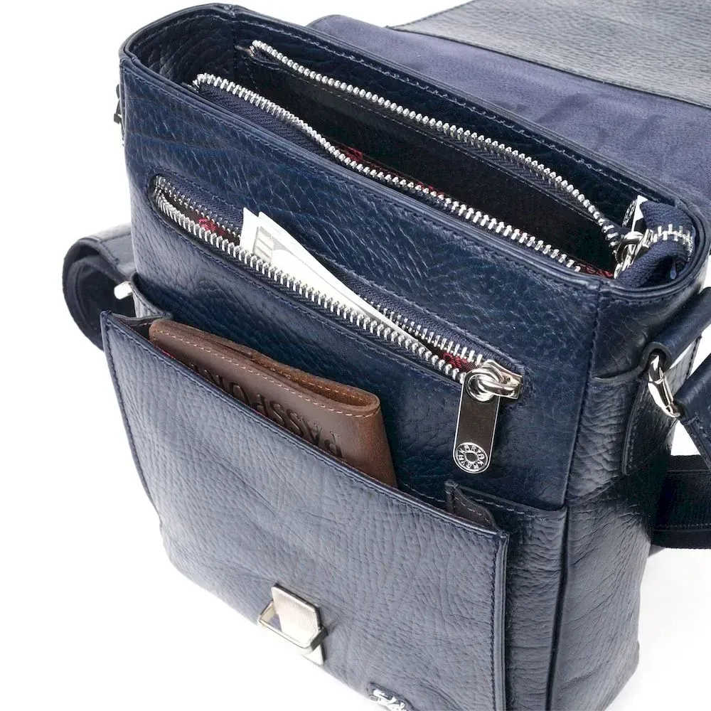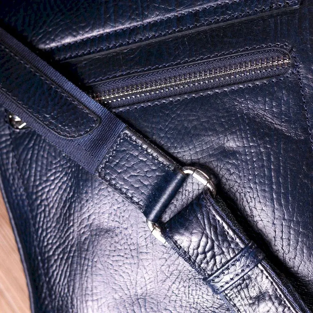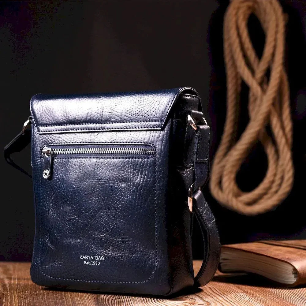 Мужская сумка синего цвета из натуральной зернистой кожи высокого качества. Аксессуар имеет надежную фурнитуру серебристого цвета и прочную подкладку. Изделие упаковано в фирменный текстильный мешок Karya. Качественная мужская сумка из натуральной кожи, всегда была отличным подарком для мужчины любого возраста.