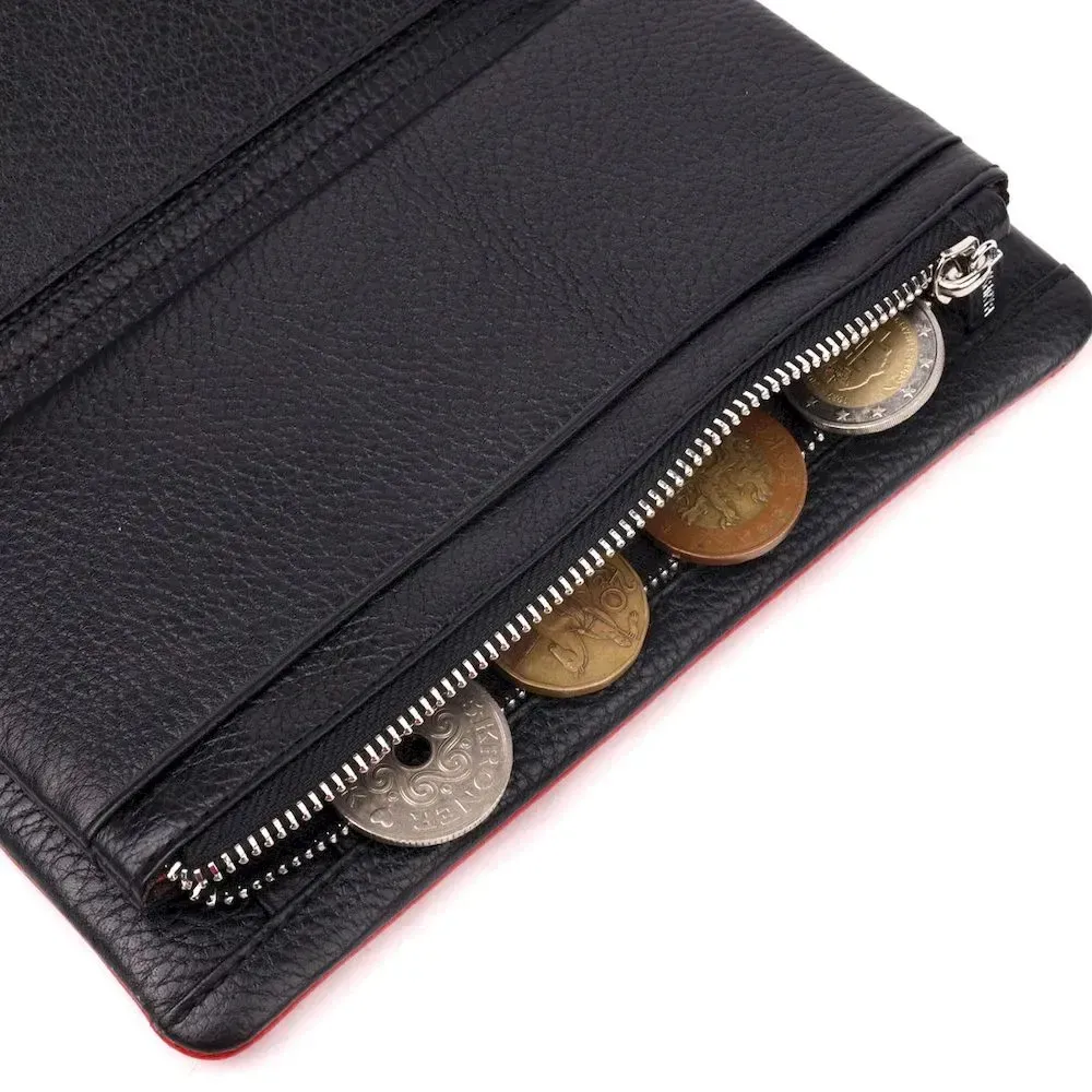 Отличный кошелек из натуральной кожи, в комбинации из двух цветов, снаружи – в красном цвете и внутри - черном. Внутренний разворот состоит из четырех открытых отделений для купюр, одного кармана с расширителем на застежке, одного скрытого кармана на молнии, одного кармана-перегородки на молнии, одного сетчатого карманчика и двенадцати секций для пластиковых карт. Складывается аксессуар пополам, с фиксацией на хлястик с магнитом. Такой кошелек из натуральной кожи - это идеальный вариант на каждый день для тех, кто ценит качество, удобство и комфорт.