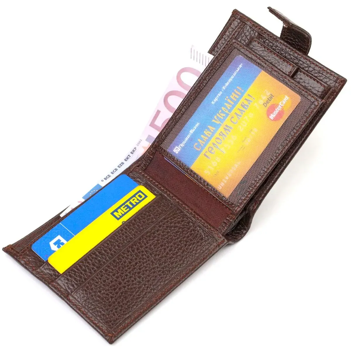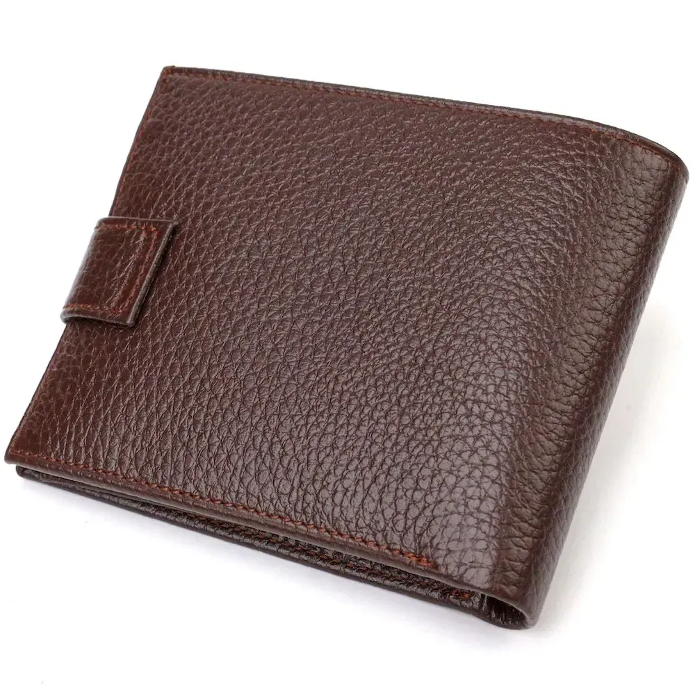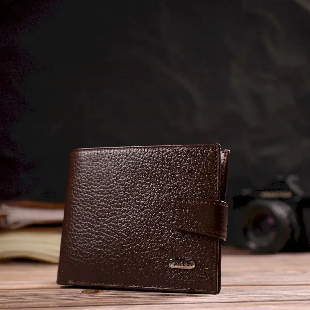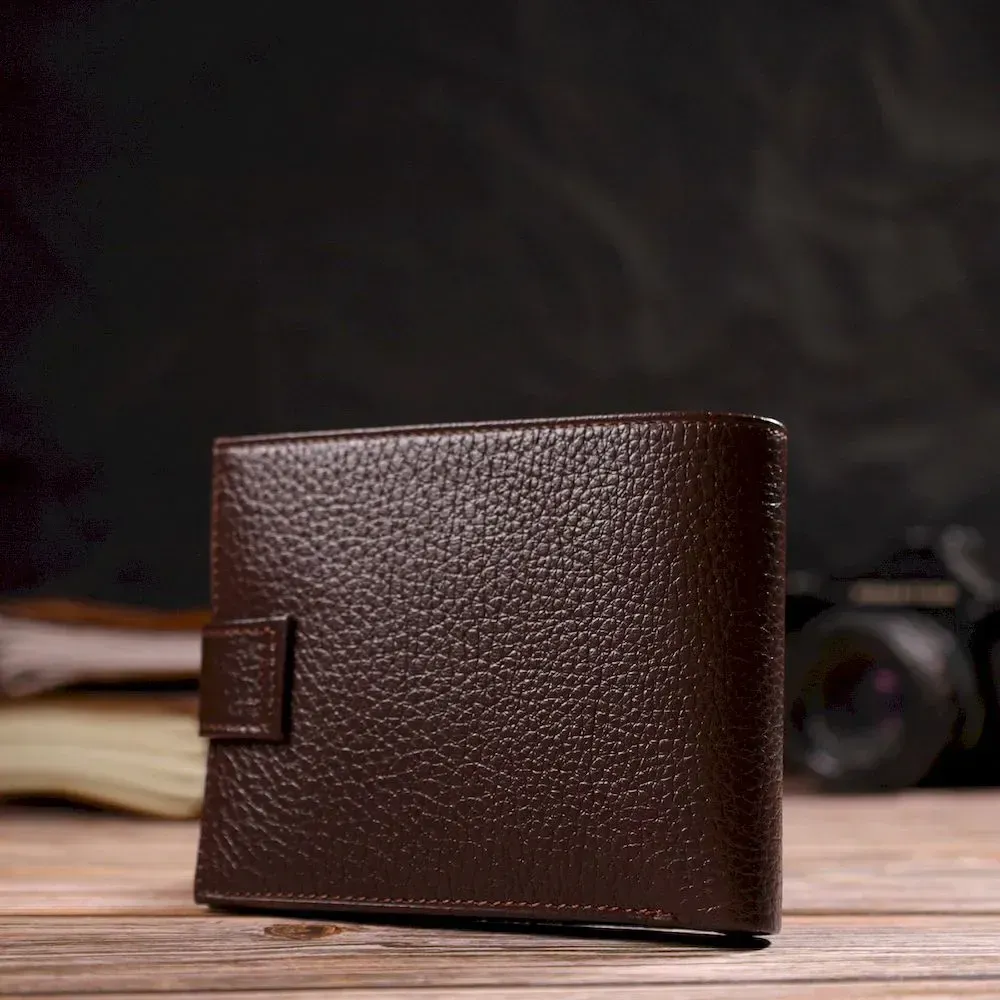 Стильное мужское портмоне среднего размера из натуральной зернистой кожи. Аксессуар имеет основное отделение для купюр с карманом-перегородкой на молнии, три ячейки для карточек, два кармана под сеточкой, два прилегающих кармана и монетницу. Кошелек складывается пополам, закрывается хлястиком на кнопку. На лицевой стороне в правом нижнем углу, расположен металлический логотип компании производителя. Многофункциональный мужской бумажник из очень прочной кожи отличный выбор подарка для солидного мужчины.