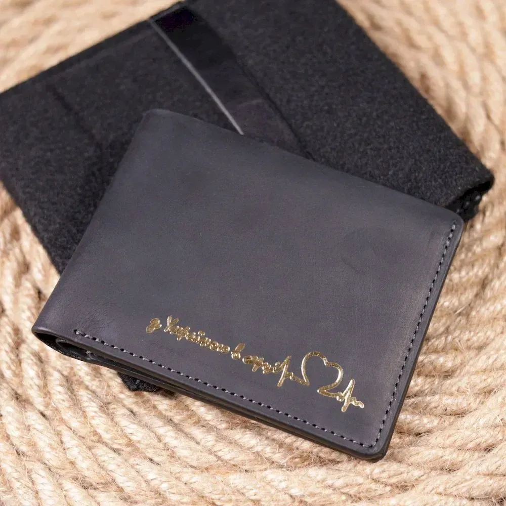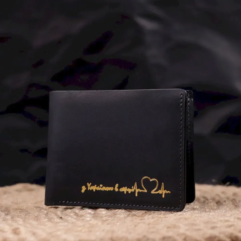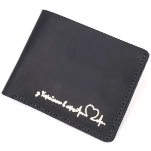 Кожаный надежный кошелек черного цвета , c патриотической надписью “З Україною в сердці”. Изделие пошито из качественной винтажной кожи, с високими показателями износостойкости . Портмоне имеет одно большое отделение для купюр всех номиналов, а также достаточное количество отделений для карт, без застежки. Кожаный кошелек станет отличным подарком на все случаи жизни.