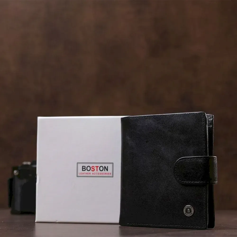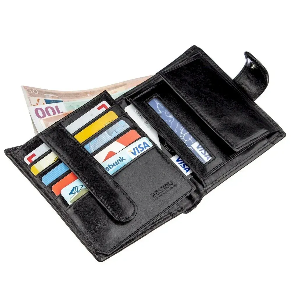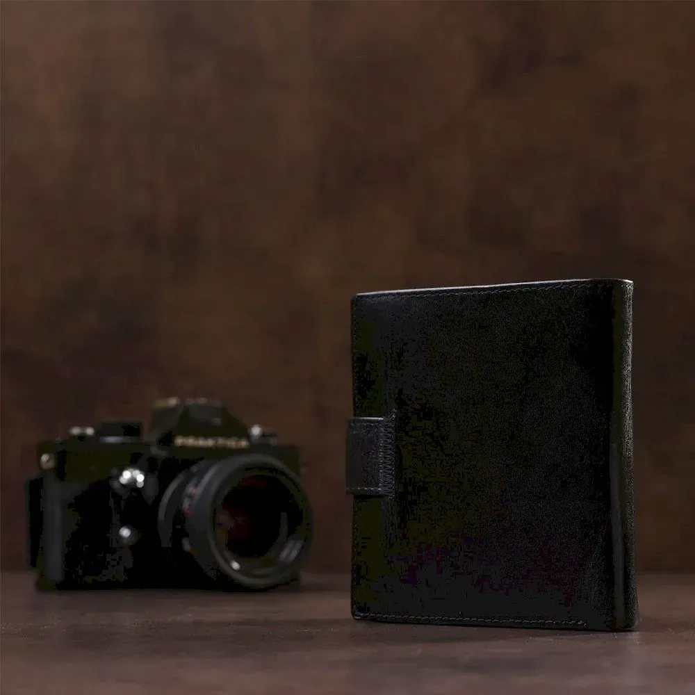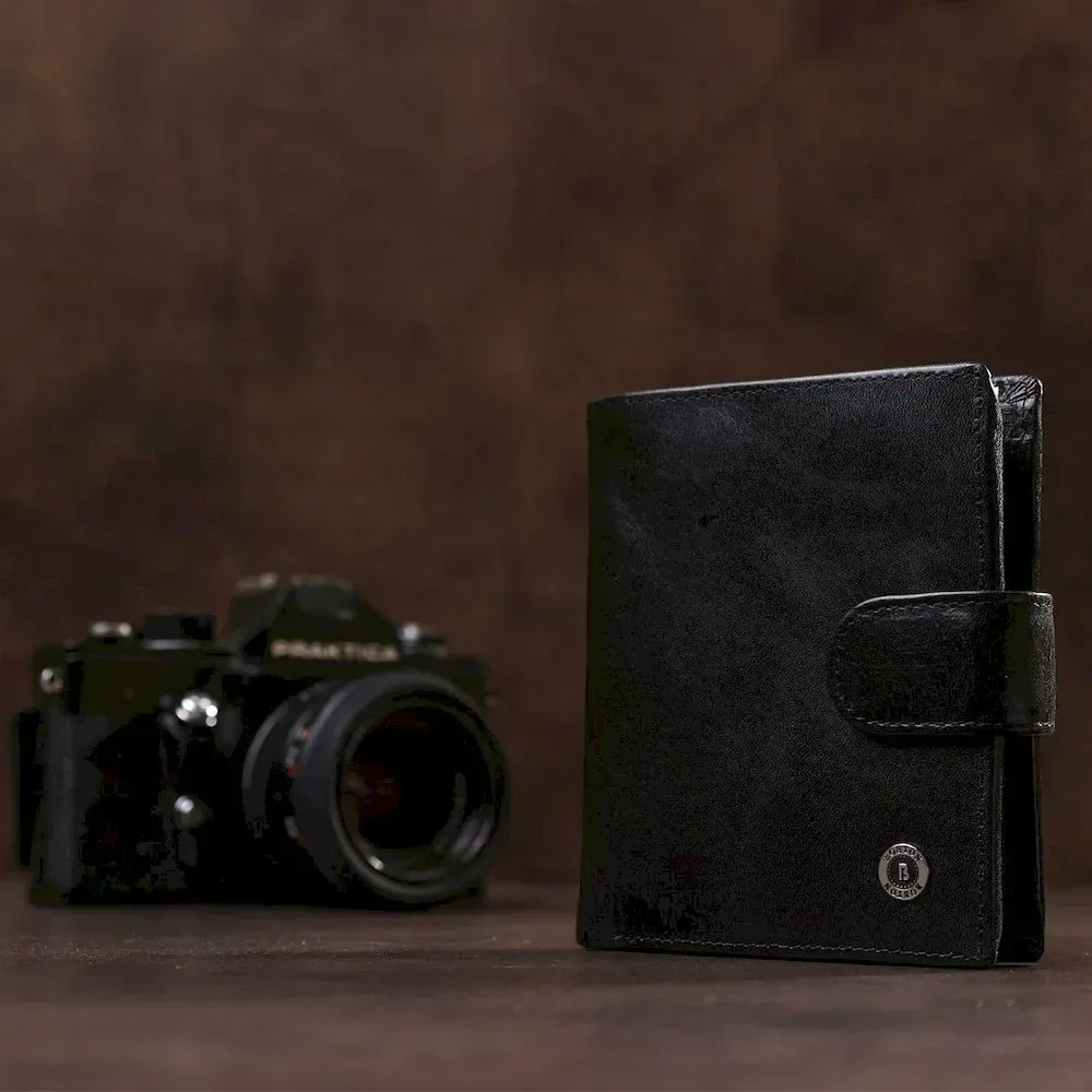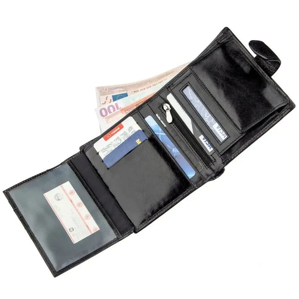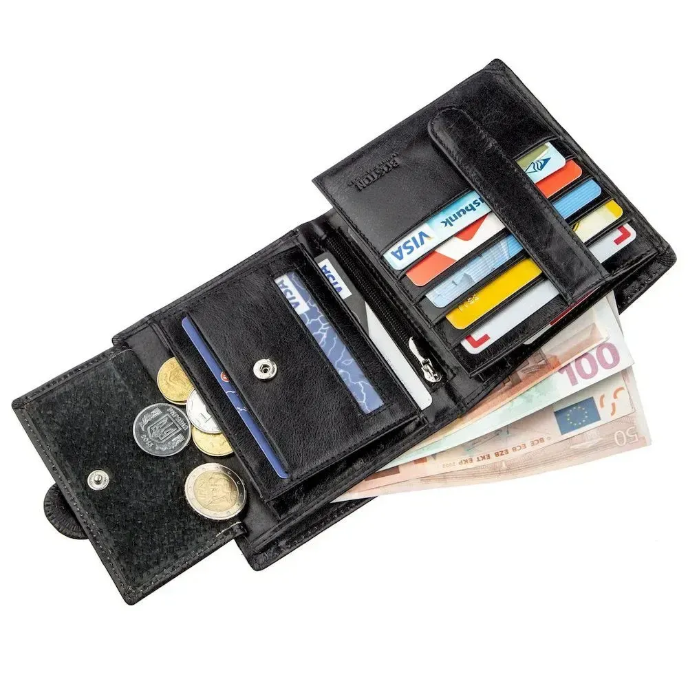 Компактный, но очень практичный и удобный мужской кошелек классического черного цвета. Выполнен данный аксессуар из натуральной кожи высокого качества, которая имеет отличные эксплуатационные характеристики. Кошелек имеет много необходимых отделений для Ваших карточек, документов и конечно же денег. Закрывается он на удобную кнопку, внутри также есть отделения на молнии. Бумажник можно носить как в кармане, так и в сумке или борсетке. Если Вы остановили свой выбор именно на этом кошельке, то Вы имеете отличный вкус и чувство стиля. Это изделие прослужит Вам очень долго. Упакован кошелек в плотную картонную коробку.