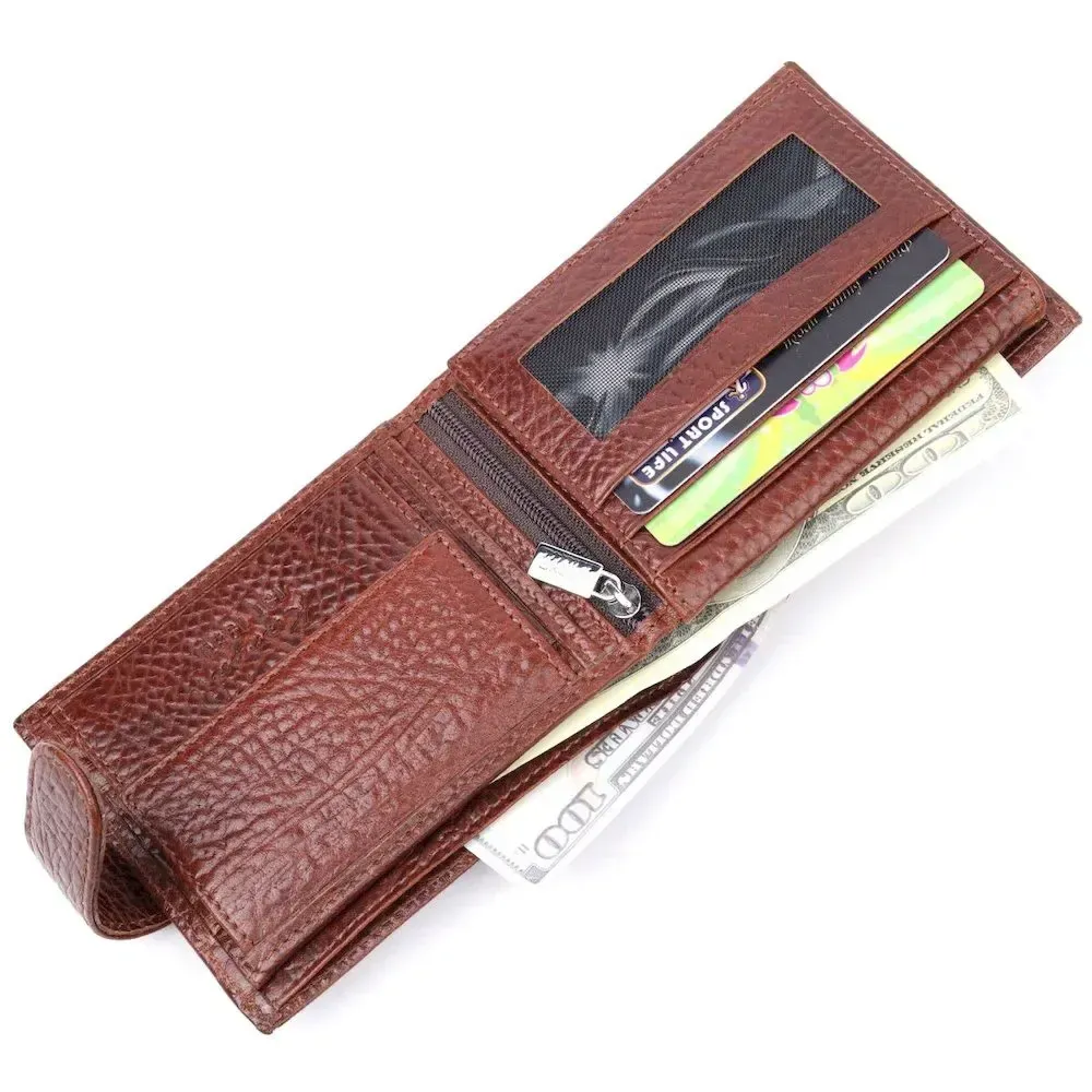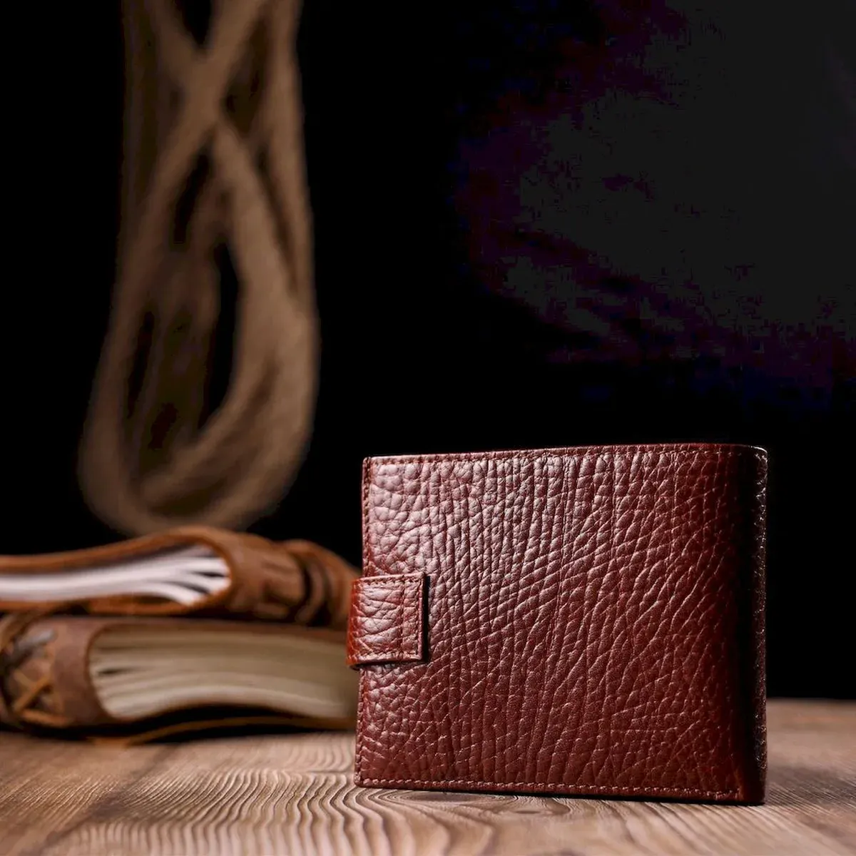 Универсальный мужской кошелек из натуральной кожи, в коричневом цвете. Изделие закрывается хлястиком на кнопку. Компактный аксессуар который легко помещается в карман или руку. Изделие упаковано в фирменную коробочку. Изделия из натуральной кожи всегда будут отличным подарком для близкого человека.