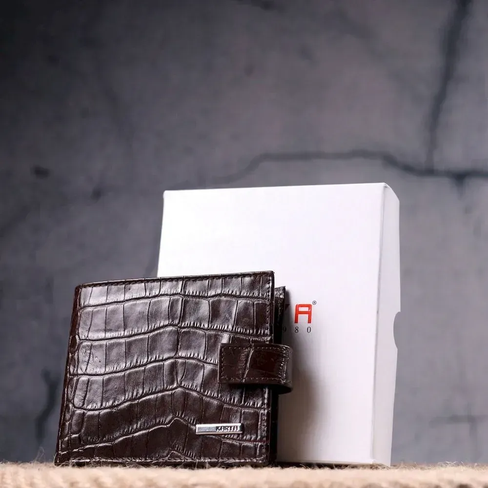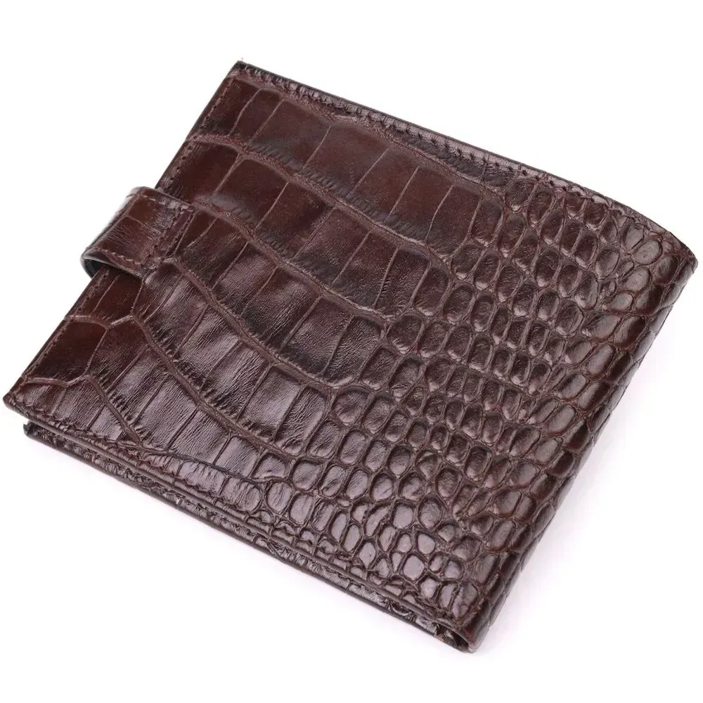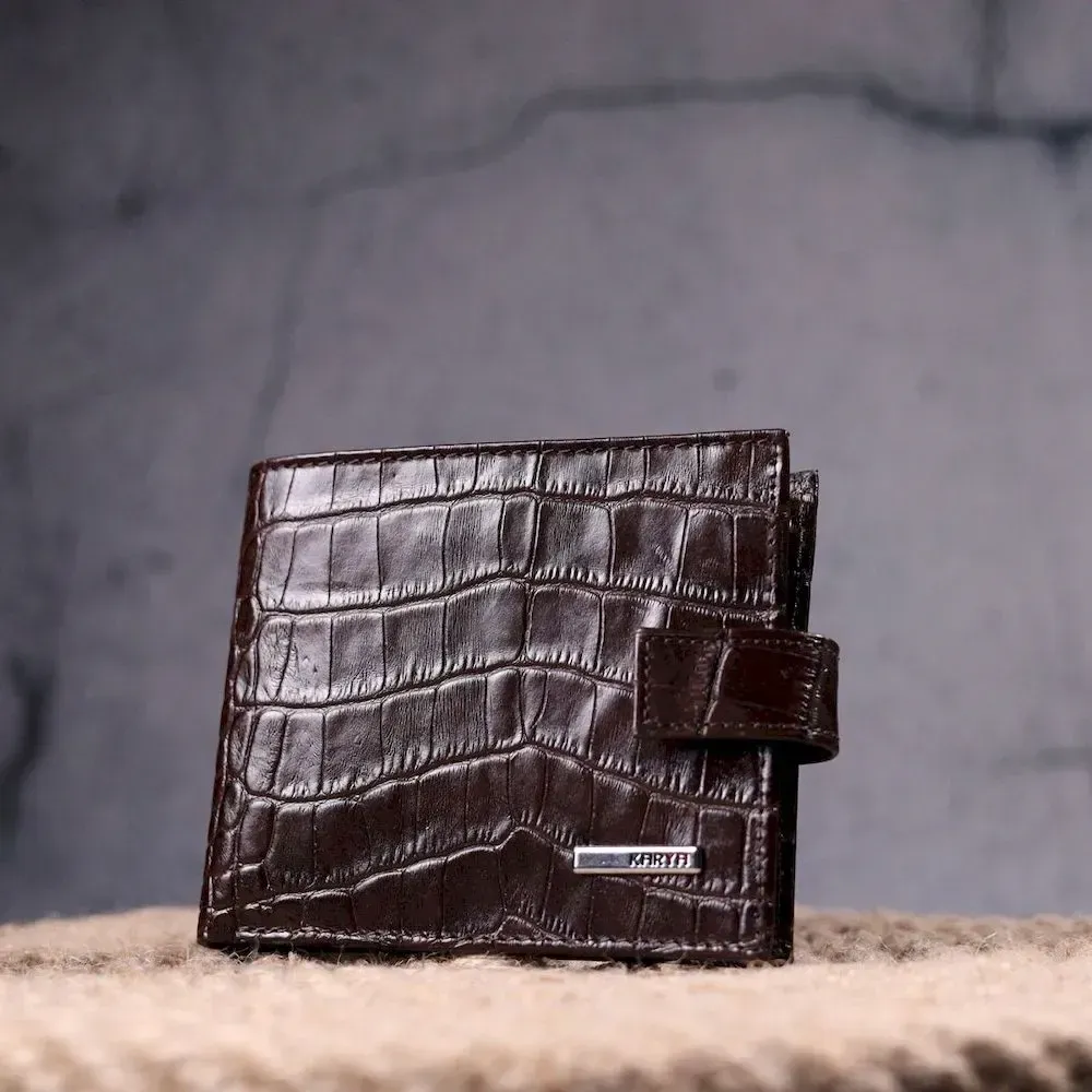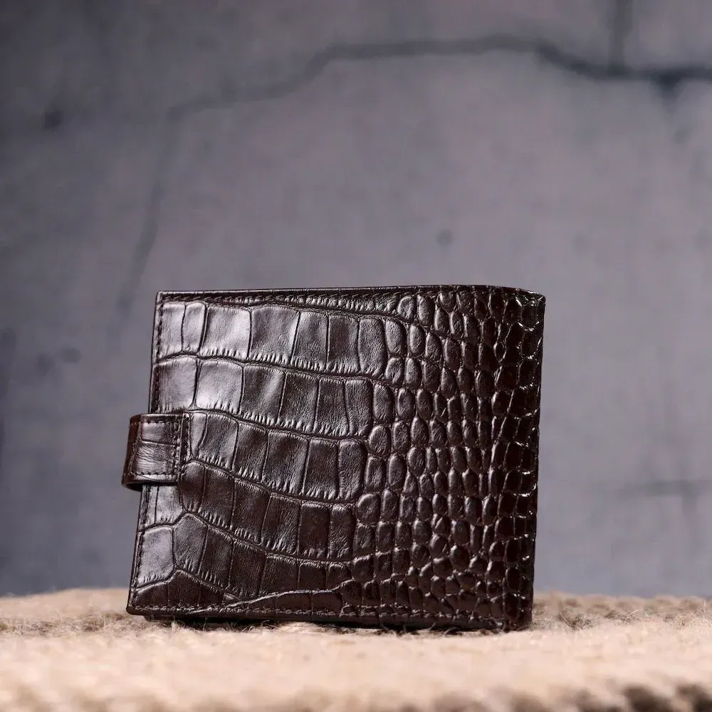 Мужское портмоне среднего размера из натуральной кожи с тиснением под крокодила в современном дизайне и красивом коричневом цвете. Такой аксессуар оценят любители натуральных и качественных вещей, изделие выполнено из натуральной кожи высокого качества. Закрывается аксессуар хлястиком на кнопку. Данный аксессуар прекрасно подойдет в качестве подарка и принесет исключительную радость близкому человеку.