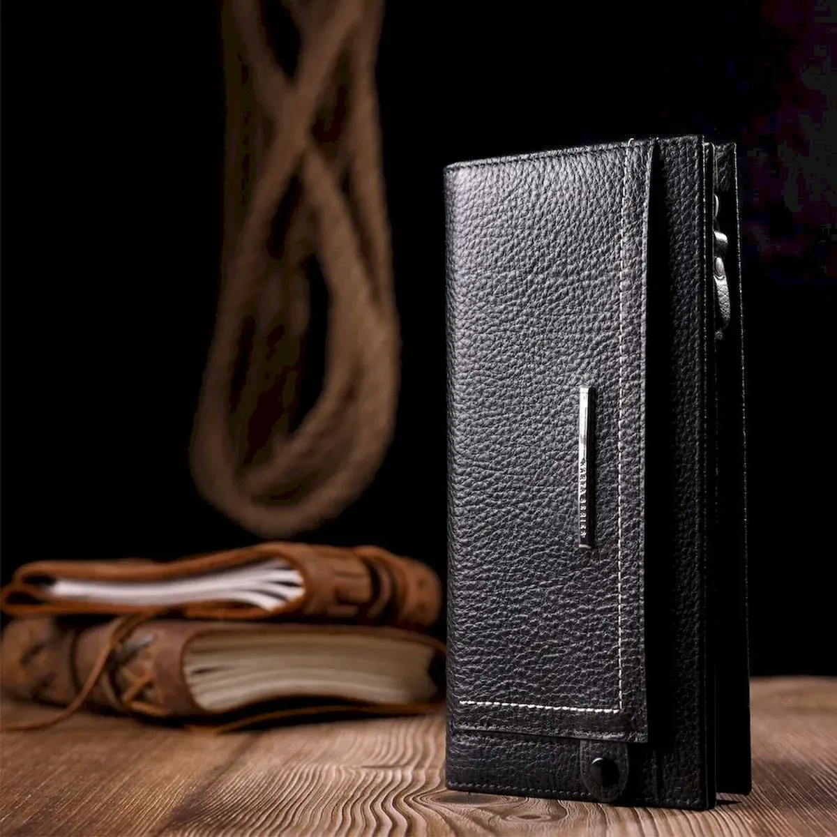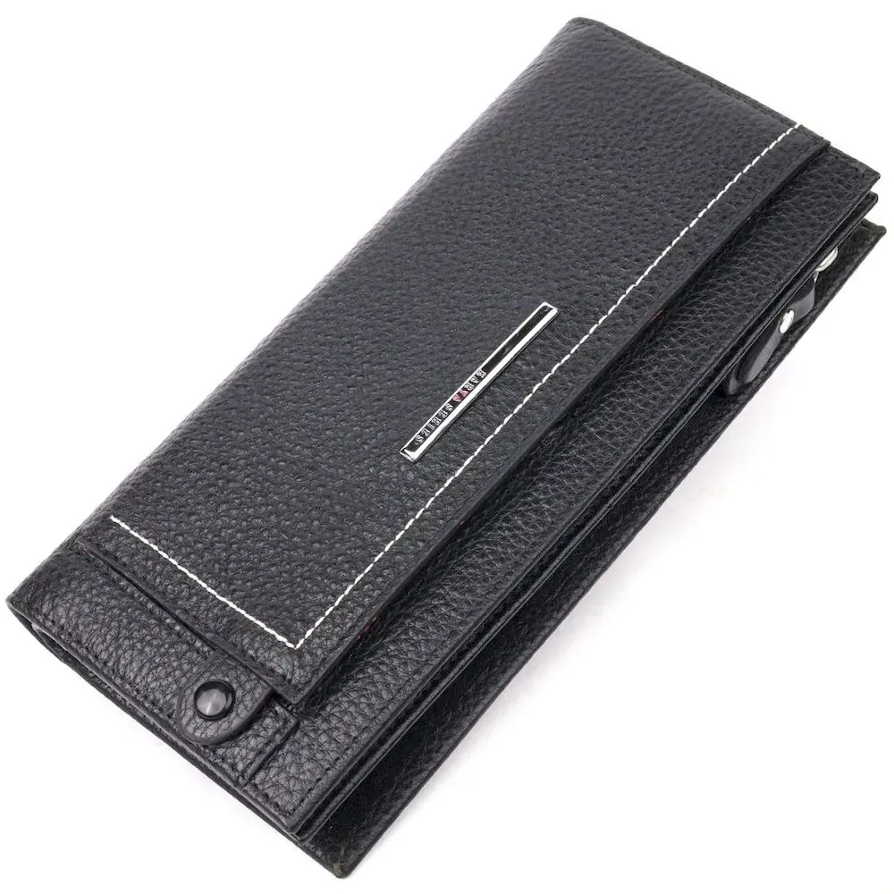 Стильный женский кошелек из натуральной кожи, в классическом черном цвете. На лицевой стороне блок для карточек, который прошит белой нитью для декора и закрывается хлястиком на кнопку. Внутри отделения для карт и документов что закрывается на магниты. Отделение на молнии для купюр без сложения. Упакован аксессуар в фирменную коробку и пакет бренда. Изделия из натуральной кожи всегда будут отличным подарком для близкого человека.