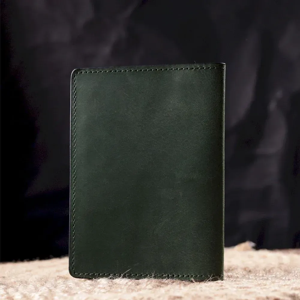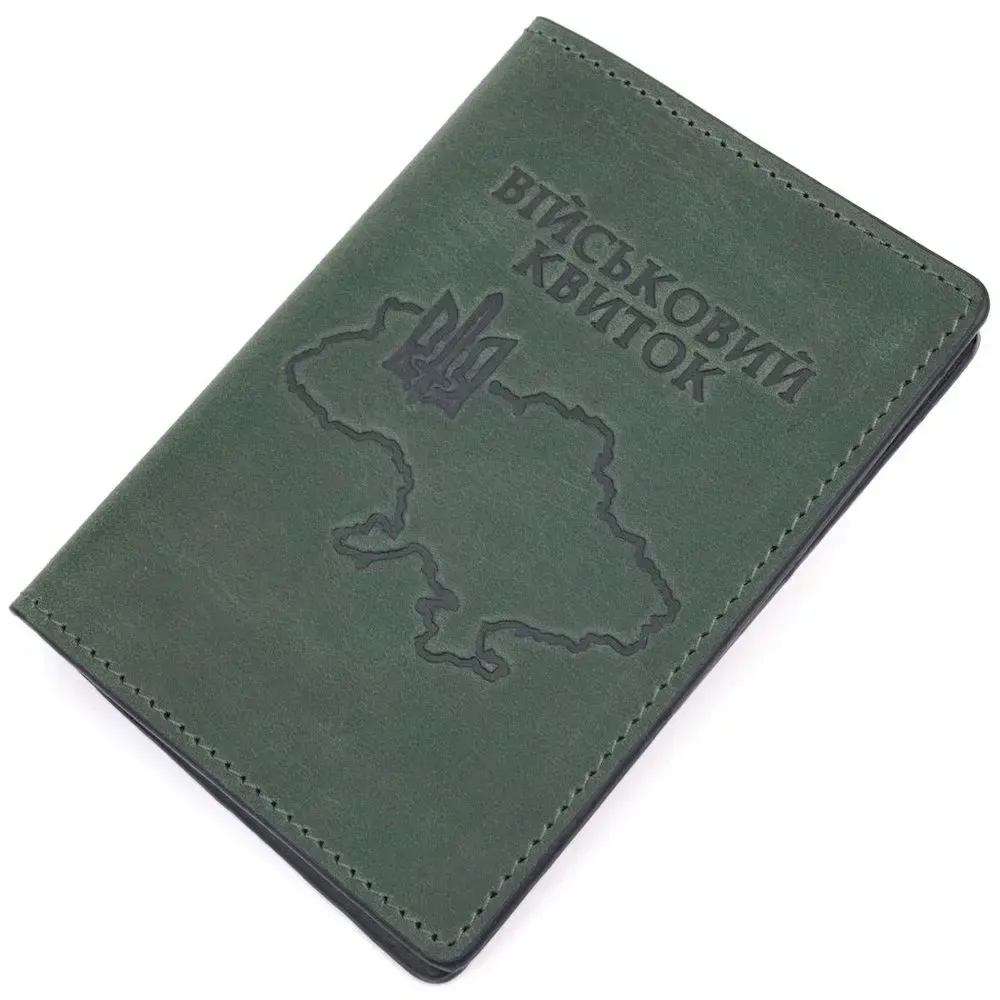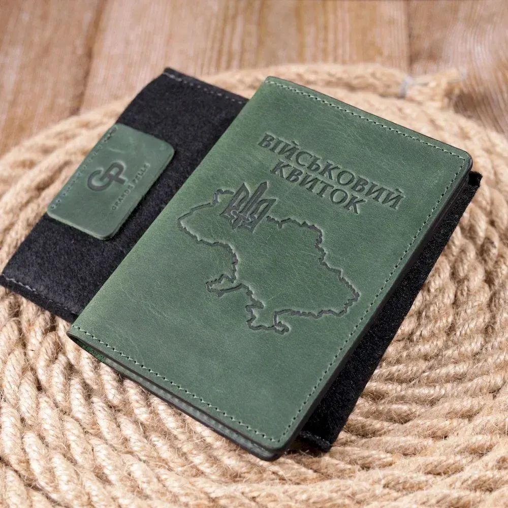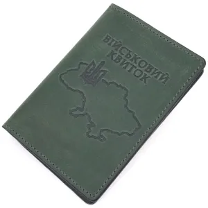 Практичная обложка зеленого цвета для военного билета с патриотическим тиснением карты Украины, на лицевой стороне. Изделие пошито с качественной гвинтажной итальянской кожи с высоким показателем износостойкости, которая защитит от повреждений документ на очень долгое время. Аксессуар имеет разворот для военного билета, две ячейки для карточек, без застежки, упакован в фирменный чехол.