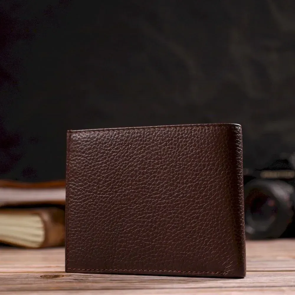 Стильный мужской кошелек из натуральной зернистой кожи. Аксессуар имеет одно основное отделение с тканевой перегородкой в которое помещаются купюры всех номиналов, три кармана для карточек, два прилегающих кармана и монетницу. Закрывается аксессуар пополам, без застежки. На лицевой стороне, в правом нижнем углу металлический логотип компании производителя. Приобретая кожаный аксессуар этой фирмы, себе или на подарок, будьте уверены, что он прослужит Вам не один год.