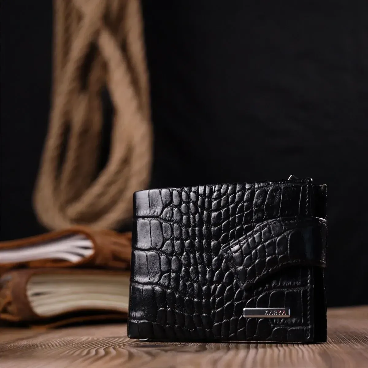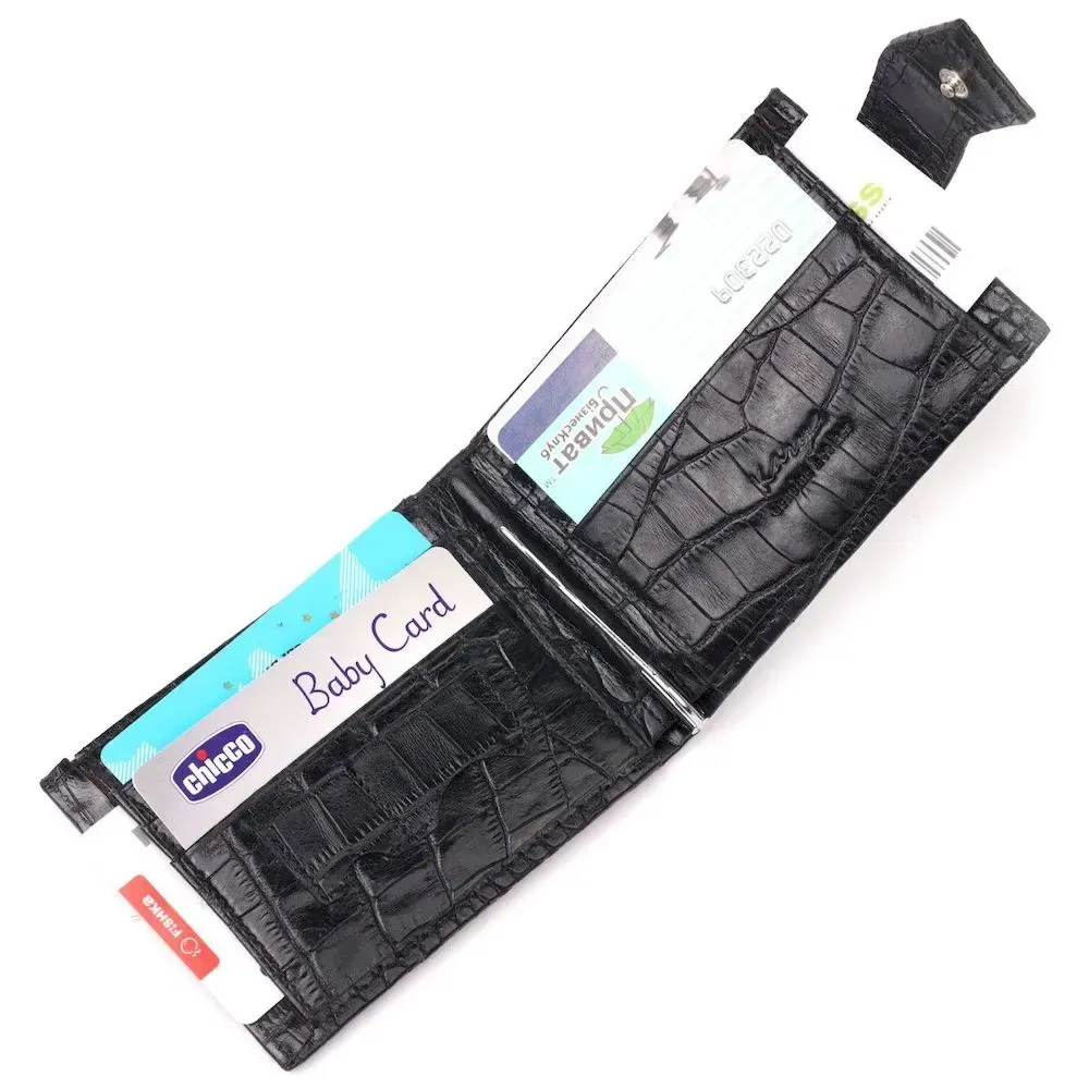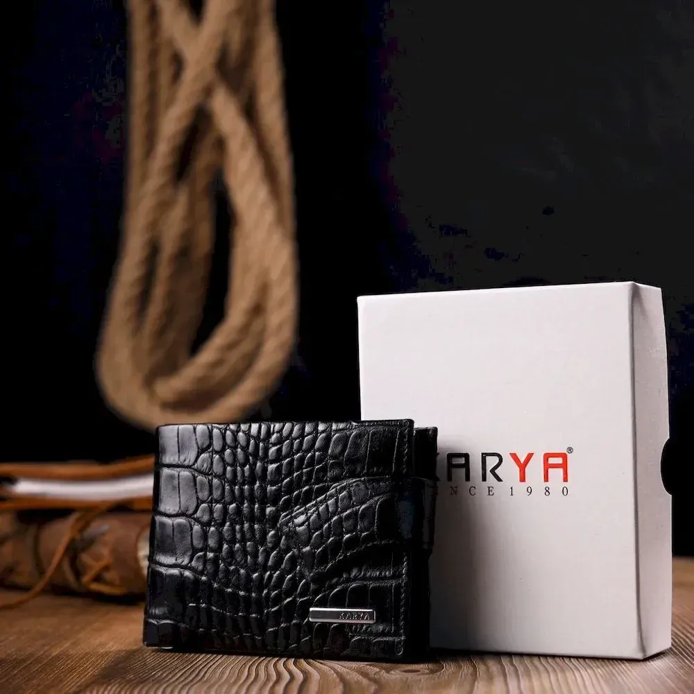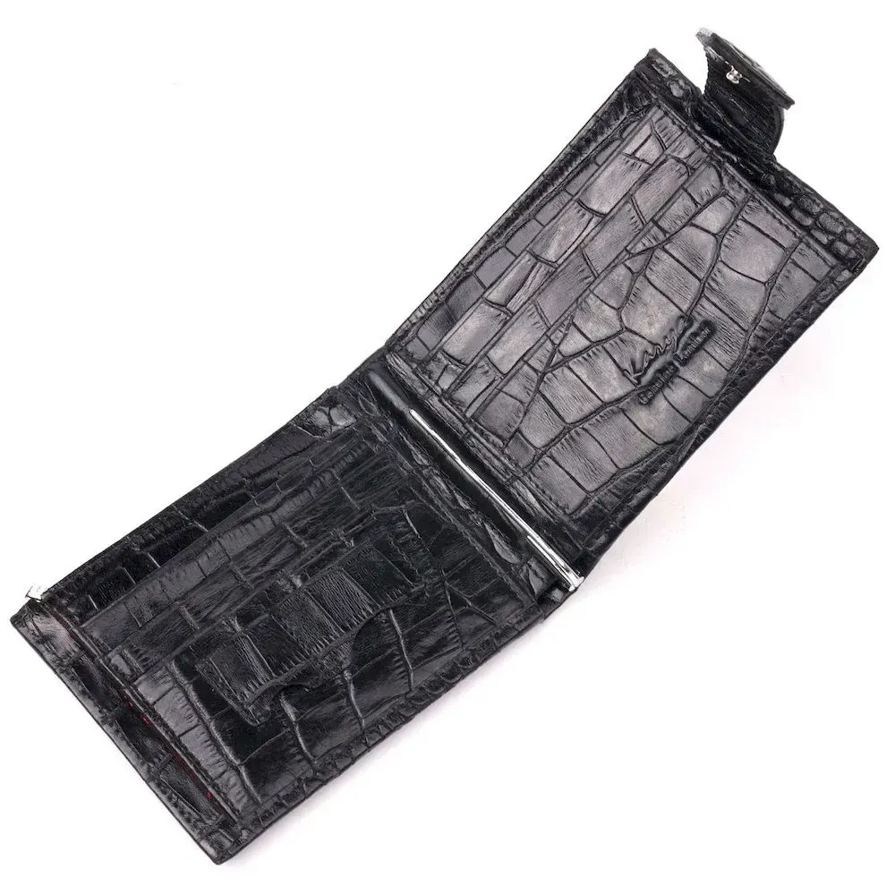 Превосходный мужской зажим из натуральной лакированной фактурной кожи под крокодила KARYA 21043 Черный