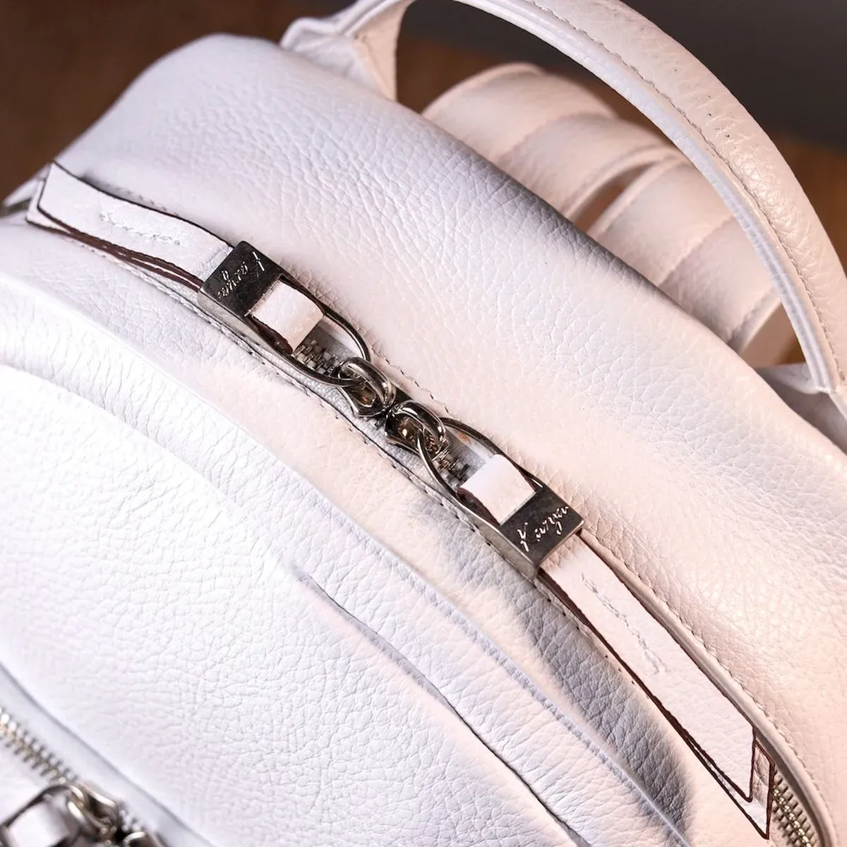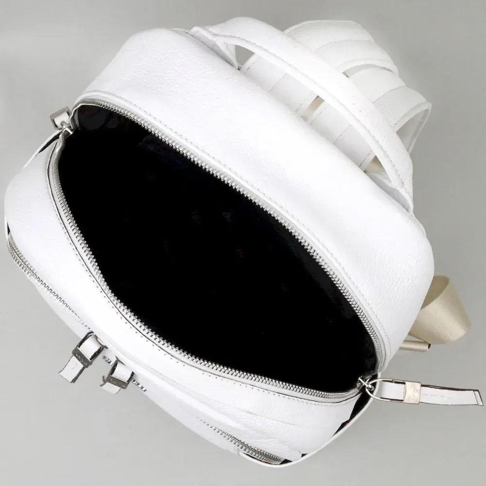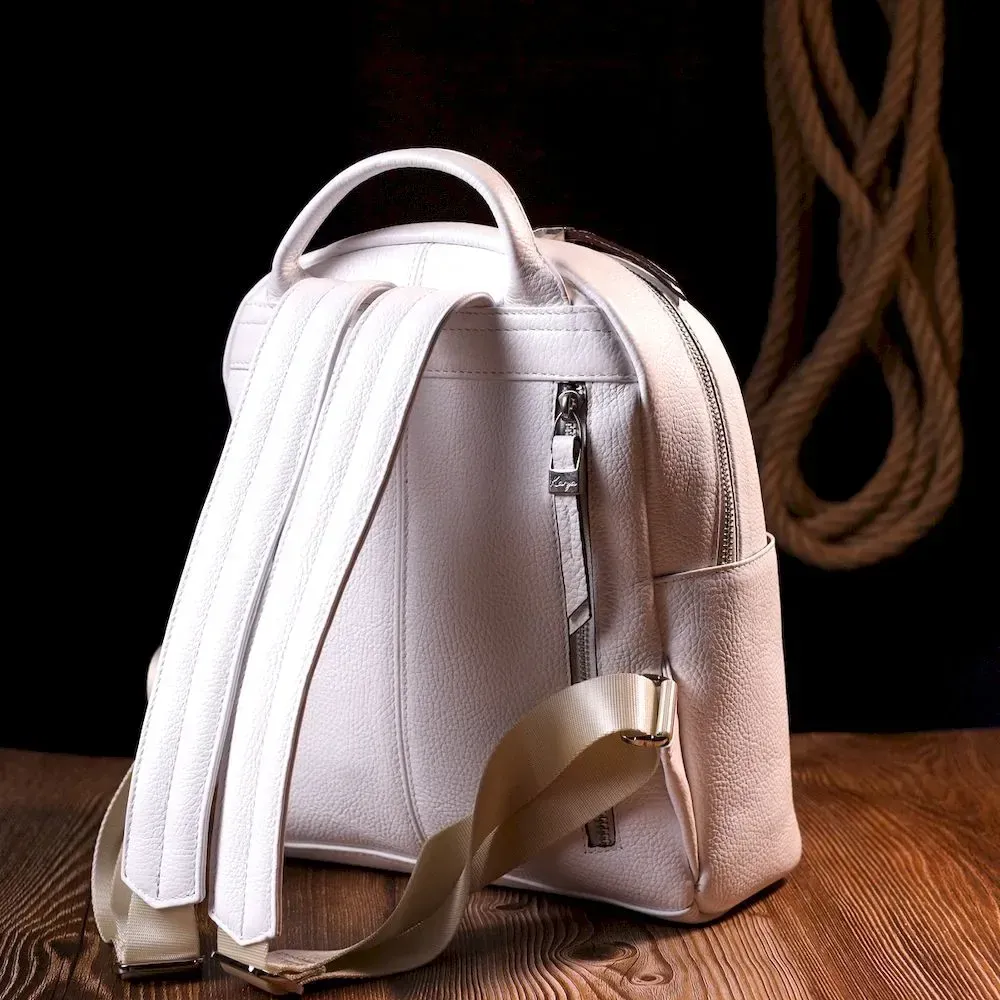 Модный рюкзак из натуральной кожи высокого качества, в белом цвете который не вытирается, не оставляет следов после заломов. Аксессуар достаточно вместительный и универсальный, туда легко влезет планшет, косметичка, книги и другие необходимые вещи. Легко сочетается практически с любым стилем в одежде: романтическим, спортивным, кэжуал и другими.