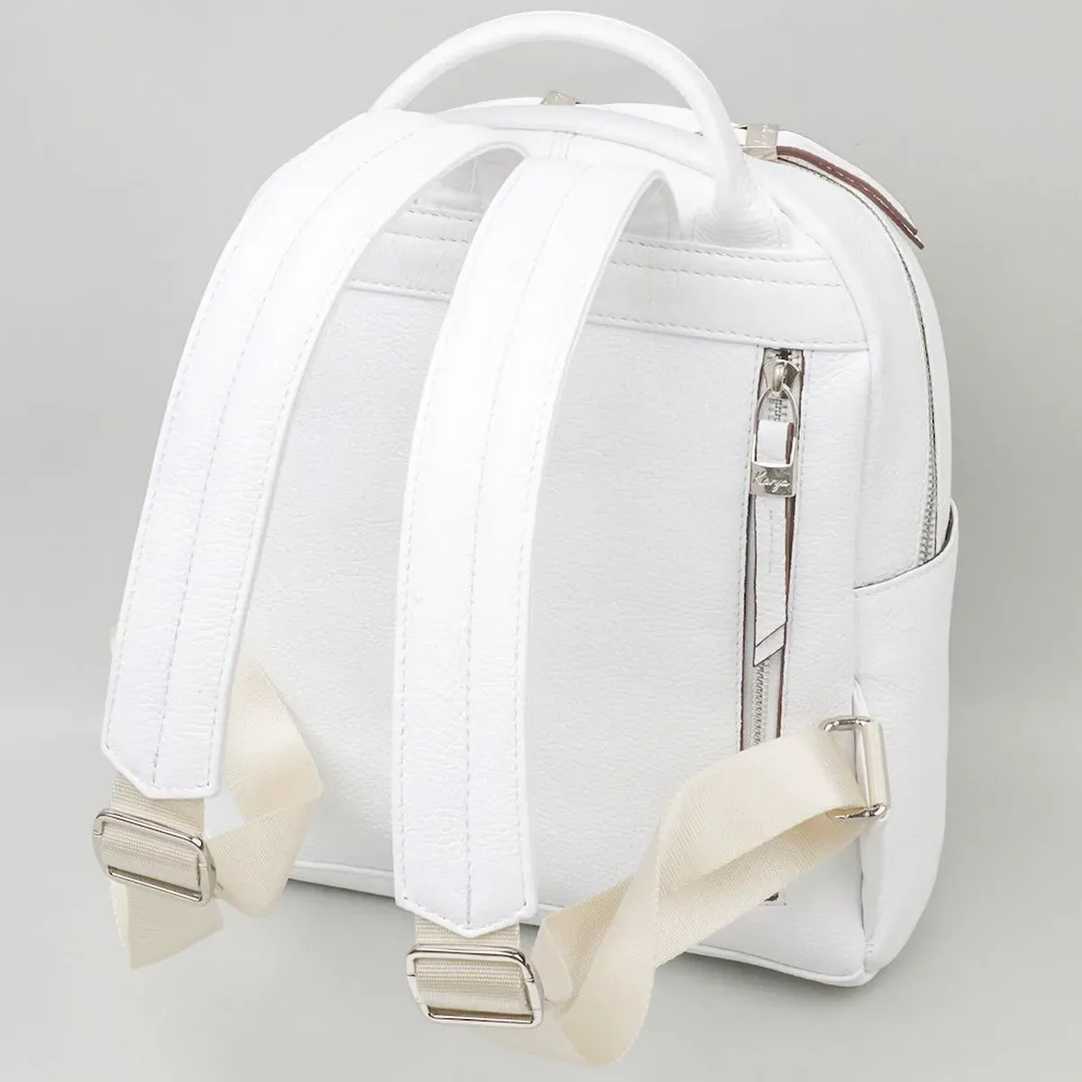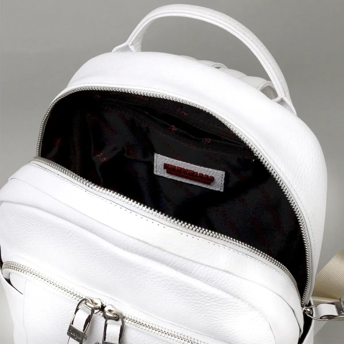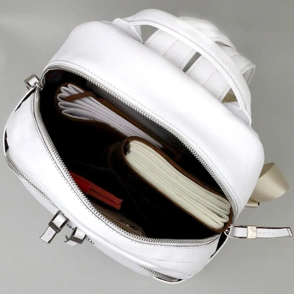 Модный рюкзак из натуральной кожи высокого качества, в белом цвете который не вытирается, не оставляет следов после заломов. Аксессуар достаточно вместительный и универсальный, туда легко влезет планшет, косметичка, книги и другие необходимые вещи. Легко сочетается практически с любым стилем в одежде: романтическим, спортивным, кэжуал и другими.