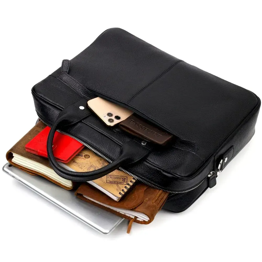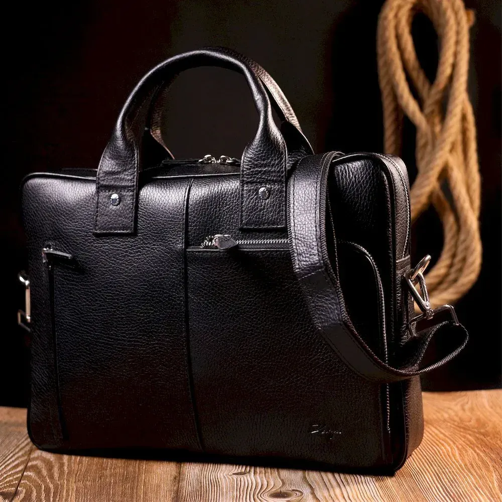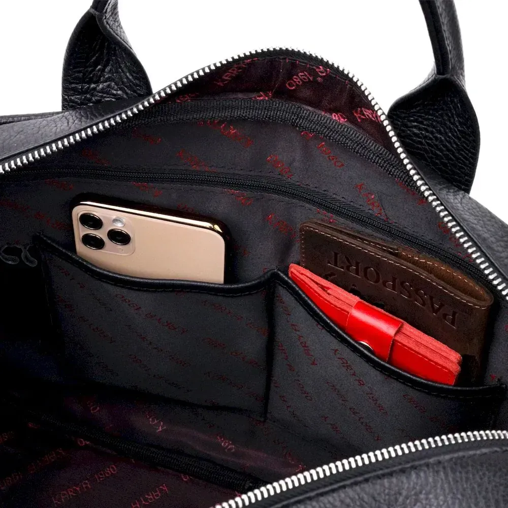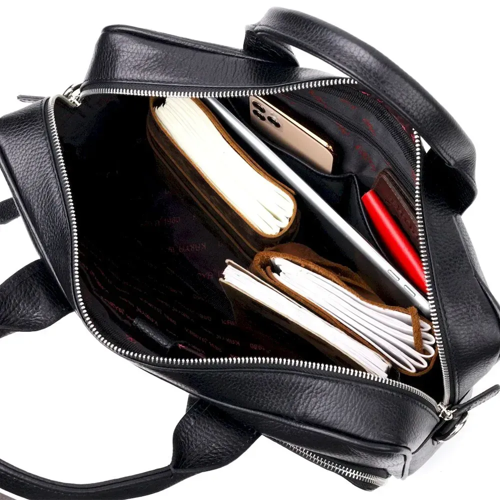 Многофункциональный портфель из натуральной кожи. Удобная и многофункциональная модель. Модель дополнена фурнитурой серебряного цвета, плюс резиновые ножки для защиты внешнего дна сумки. Внутри сумки качественная подкладка. Сумку можно переносить в руке при помощи удобных кожаных ручек, а также через плечо (в комплекте съемный, регулируемый плечевой ремень, который выполнен в комбинации текстильного материала и натуральной кожи). Будет идеальным вариантом для подарка близкому человеку.