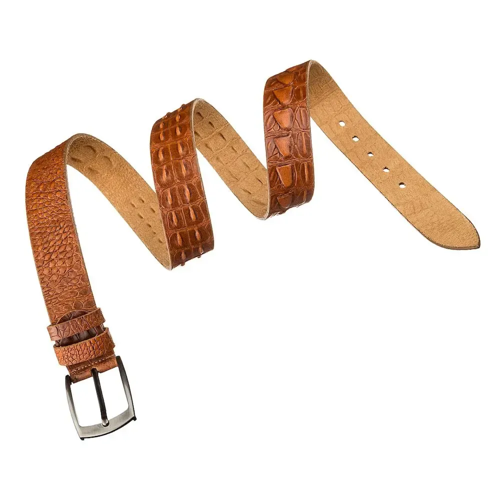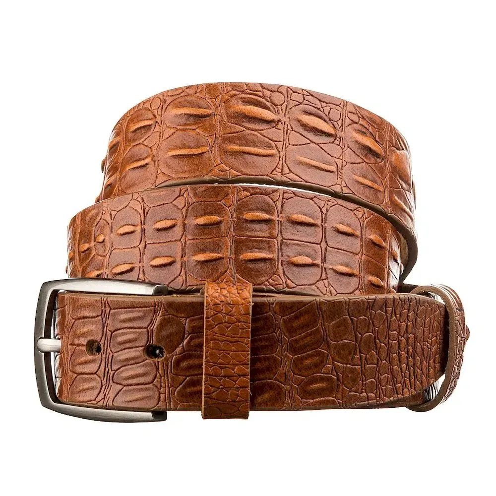 Необычный мужской джинсовый ремень из натуральной высококачественной кожи, с фактурой под крокодила. Цвет фурнитуры: темное серебро. Изделие упаковано в красивую коробочку. Кожаный ремень является отличным решением для подарка мужчине к любому празднику.