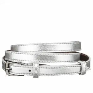 Узкий кожаный ремень из натуральной кожи высокого качества. Пряжка маленькая, аккуратная. Цвет: под темное серебро. Очень красивый и стильный аксессуар, который можно носить под любую одежду, дополняя свой индивидуальный образ. Пояс упакован в стильную картонную коробку.