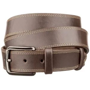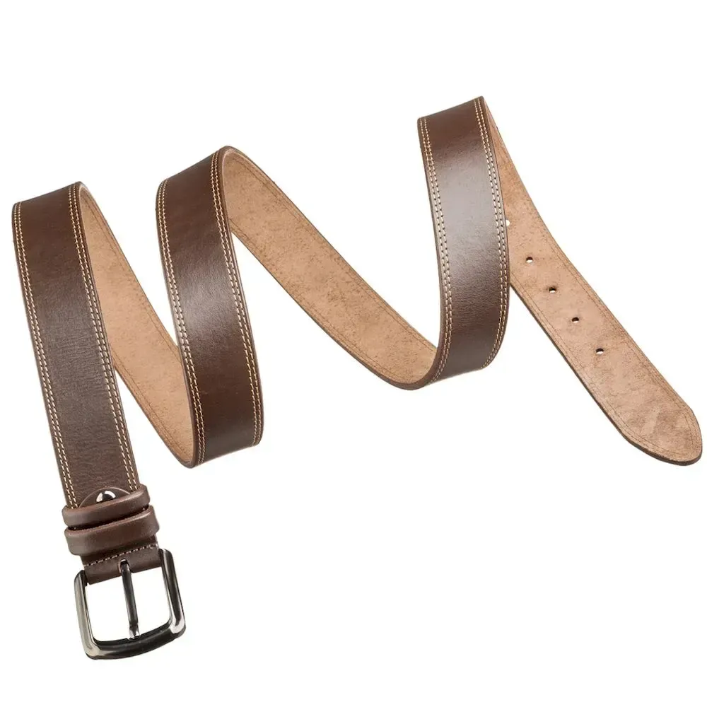 Полотно однотонное, коричневое, аккуратно оформлено двойной строчкой по краю. Пряжка из крепкого металла, с классической застежкой цвета темного серебра. Ремень имеет функцию регулировки длины, лишние сантиметры можно самостоятельно убрать. Такой аксессуар просто необходим в гардеробе каждого мужчины. В нашем магазине вы сможете выбрать брендовые кожаные ремни и пояса на любой вкус. Черный цвет ремня является универсальным в использовании. Может быть отличным подарком для вашего мужчины.