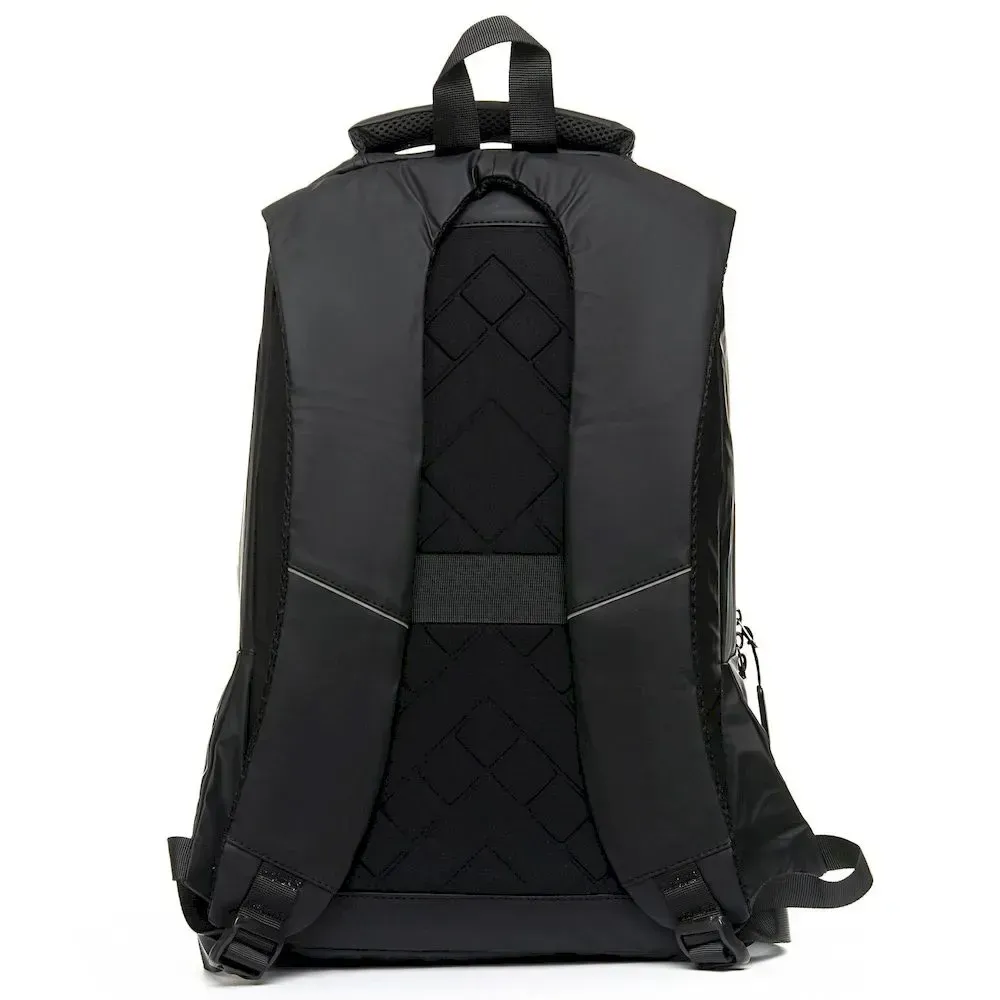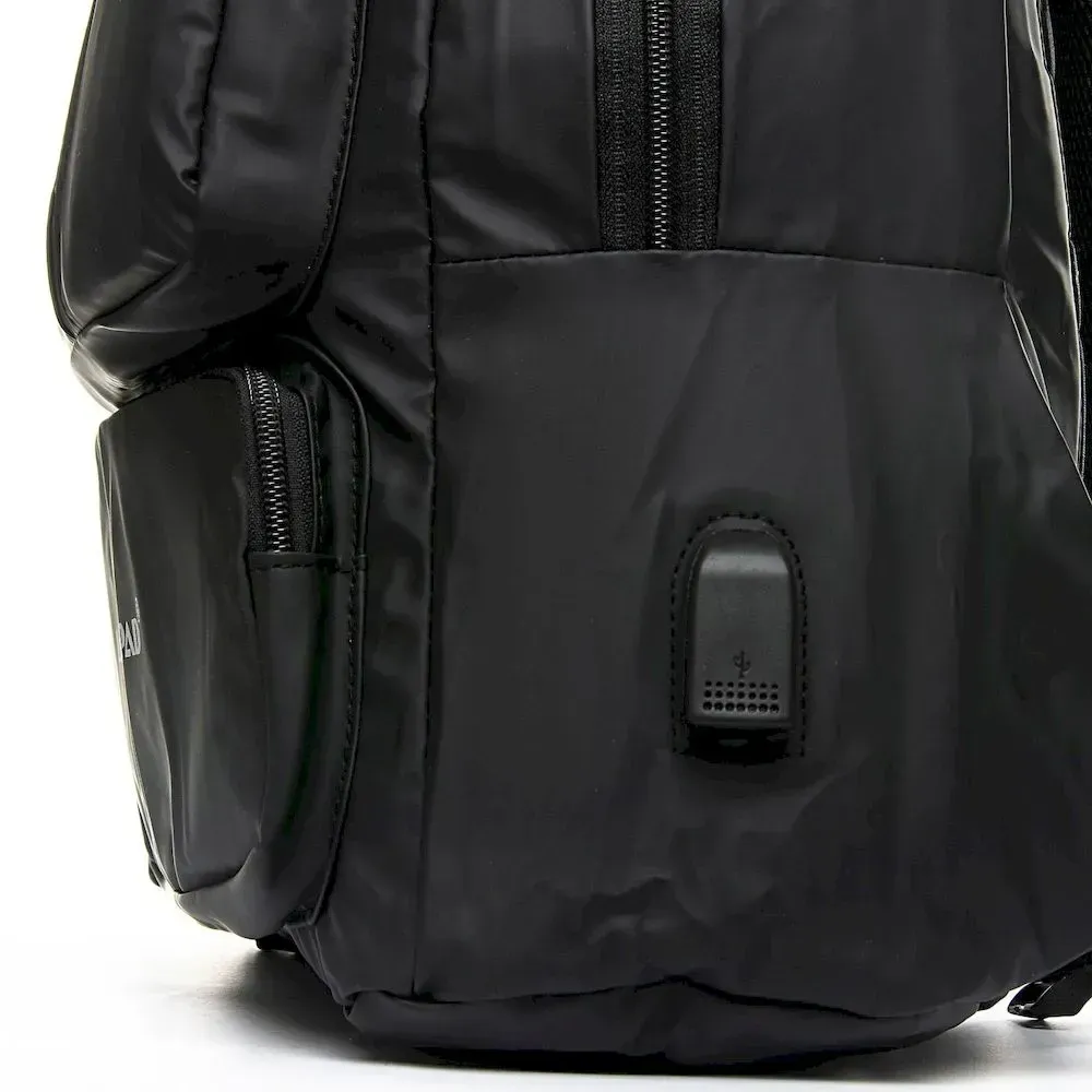 Рюкзак городской Lanpad. Изготовлен из материала с водоотталкивающим покрытием. Плотная спинка. Два отделения, закрываются на молнию. Внутри есть боковой открытый двойной карман и карман для ноутбука. Из отделения выведен на наружную боковую стенку USB кабель. На фасаде находятся два больших кармана на молнии. На задней стенке есть крепление на ручку чемодана. Плечевые лямки регулируется по длине.