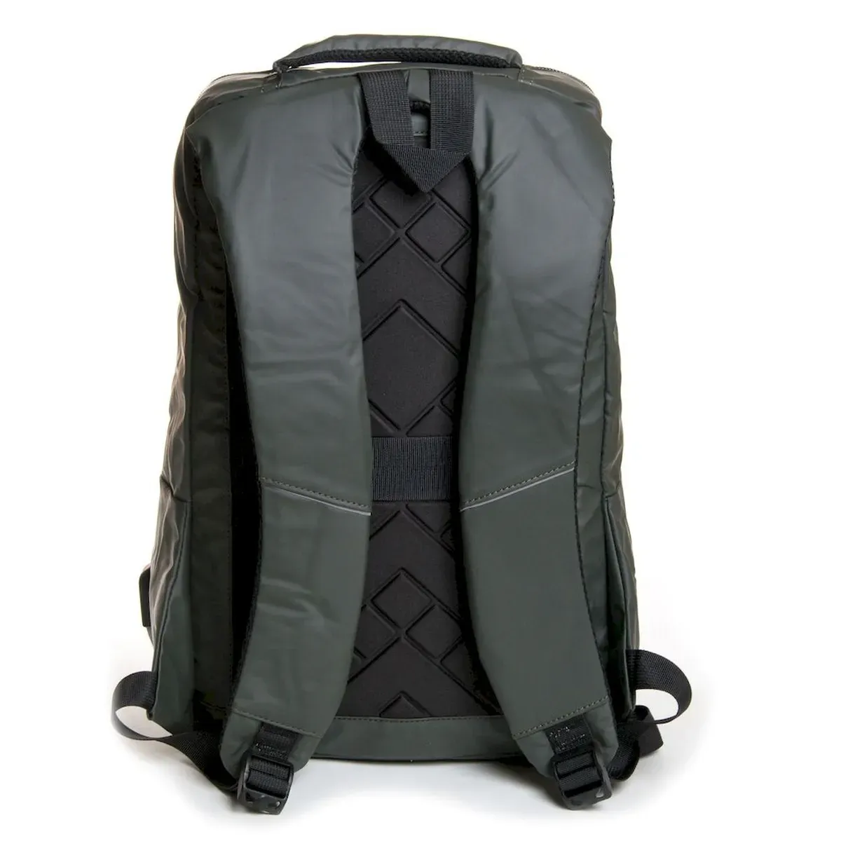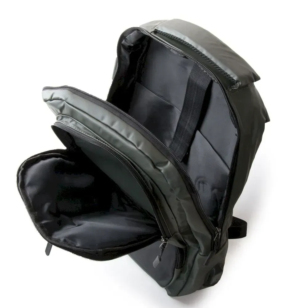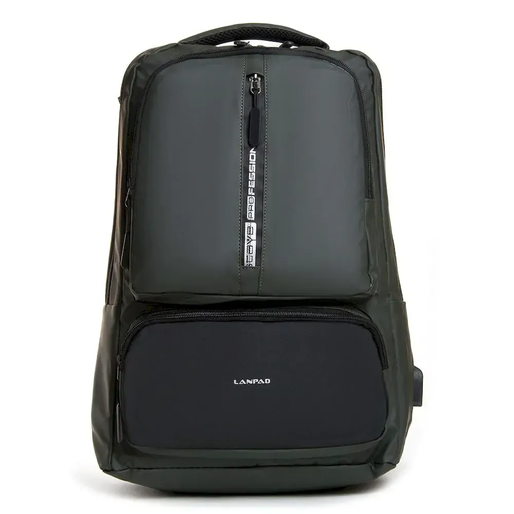 Рюкзак городской Lanpad. Изготовлен из материала с водоотталкивающим покрытием. Плотная спинка. Два отделения, закрываются на молнию. Внутри есть боковой открытый двойной карман и карман для ноутбука. Из отделения выведен на наружную боковую стенку USB кабель. На фасаде находятся два больших кармана на молнии. На задней стенке есть крепление на ручку чемодана. Плечевые лямки регулируется по длине.