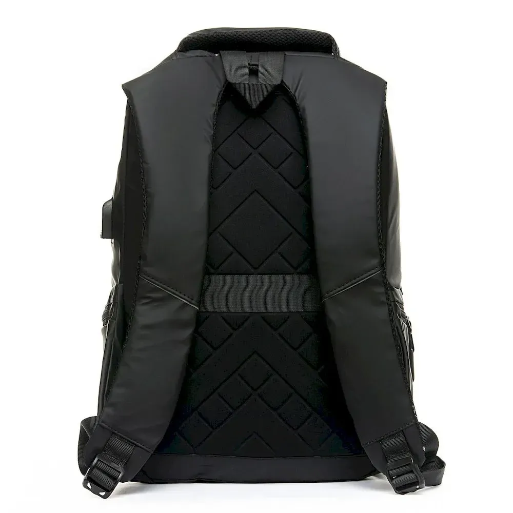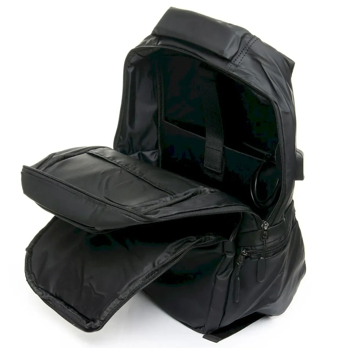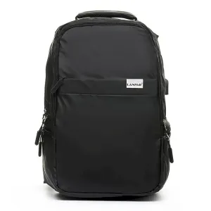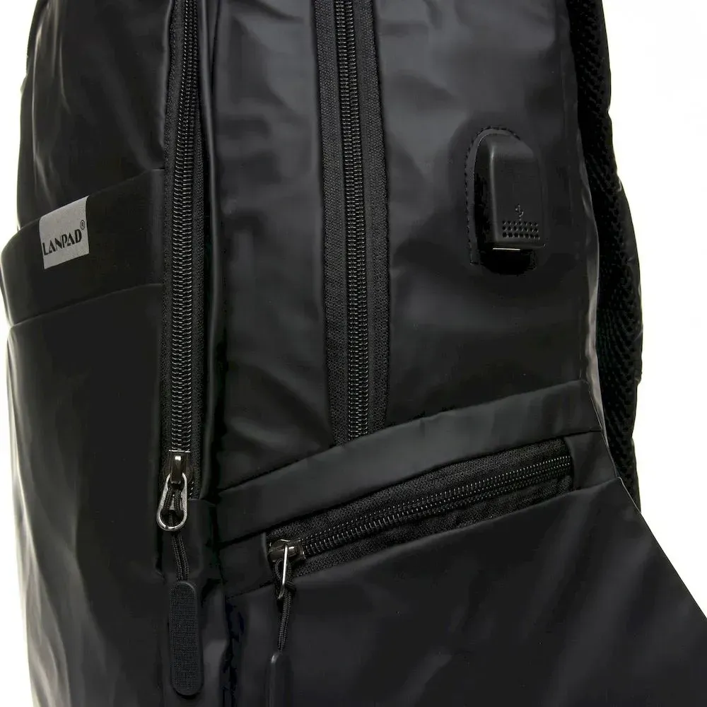 Рюкзак городской Lanpad. Изготовлен из материала с водоотталкивающим покрытием. Плотная спинка. Два отделения, закрываются на молнию. Внутри есть боковой открытый двойной карман и карман для ноутбука. Из отделения выведен на наружную боковую стенку USB кабель. На фасаде находится большой карман на молнии, а на боковых стенках небольшие карманы. На задней стенке есть крепление на ручку чемодана. Плечевые лямки регулируется по длине.