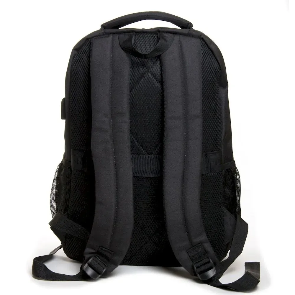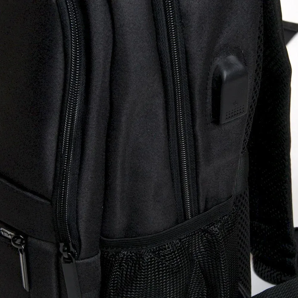 Рюкзак городской Lanpad. Изготовлен из плотного материала. Уплотненная вентилируемая спинка. Два отделения, закрываются на молнию. Внутри есть боковой открытый двойной карман и карман для ноутбука. Из отделения выведен на наружную боковую стенку USB кабель. На фасаде находятся два больших кармана на молнии. А на боковых стенках - открытые карманы-сетки. На задней стенке есть крепление на ручку чемодана. Плечевые лямки регулируется по длине.