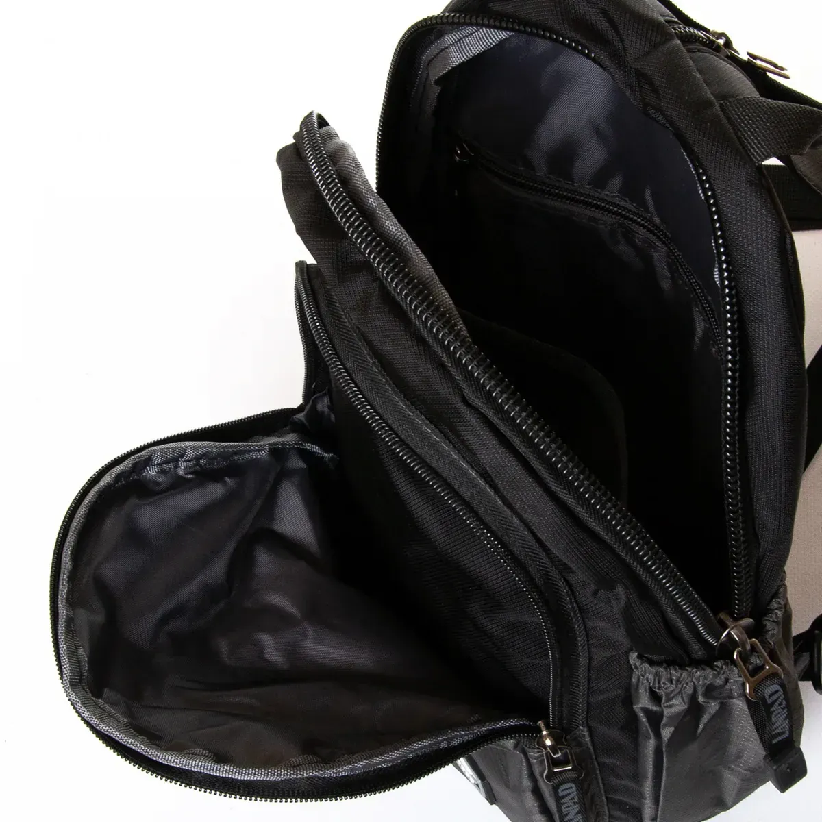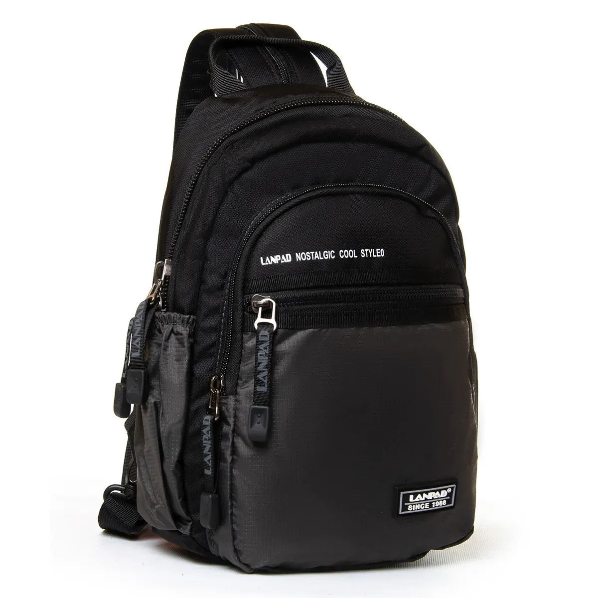 Мужская большая сумка-рюкзак Lanpad. Одно основное отделение, закрывается на молнию. Внутри отделения есть карман на молнии и открытый карман. На фасаде и обратной стороне находятся вместительные карманы на молнии. На боковых сторонах сумки есть открытые небольшие карманы.
