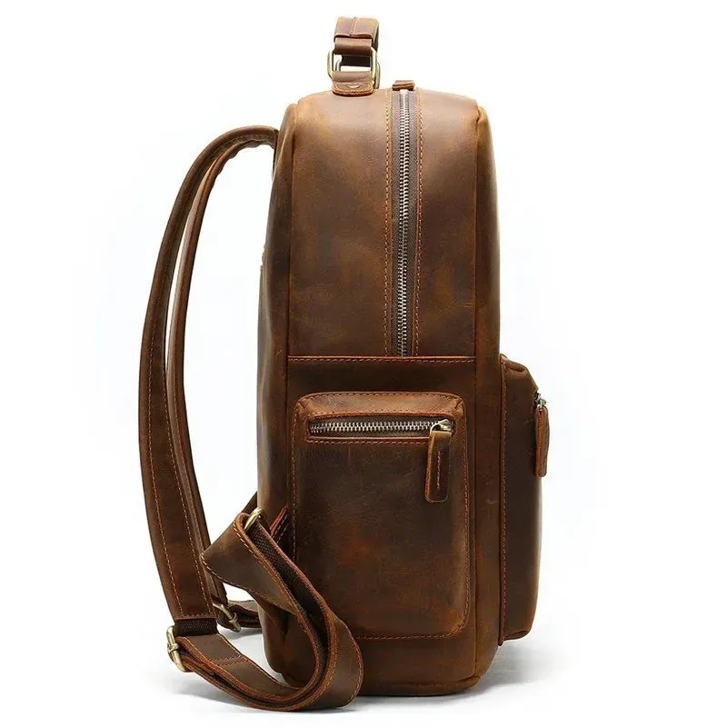 Вместительный кожаный рюкзак с эффектными потертостями. Аксессуар мягкий на ощупь. Кожа такого типа напоминает нубук. Отличный вариант для города, так и в поездку. Рюкзак очень хорошо носится и удобен в использовании. Цвет фурнитуры: золотистый. Подкладка данного аксессуара выполнена из прочного текстильного материала коричневого цвета. Есть удобная ручка для удобства в руке и лямки на плечи.