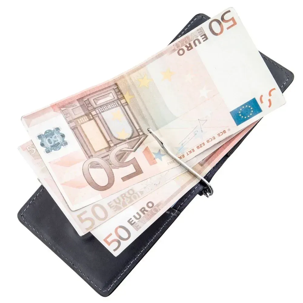 Компактный зажим из итальянской натуральной кожи высочайшего качества синего цвета. На лицевой стороне и внутри аксессуара тисненый логотип бренда-производителя и ровная строчка по краям изделия. Модель закрывается надежными магнитами. Изделие станет для вас идеальным решением, если вы не являетесь поклонником портмоне или клатчей. За счет своего компактного размера зажим легко поместится в карман или небольшую сумку. Вы также можете положить в него пару необходимых кредиток. Сама конструкция зажима изготовлена из крепкого металла. Изделие станет прекрасным подарком для близкого человека. Модель упакована в войлочный чехол.