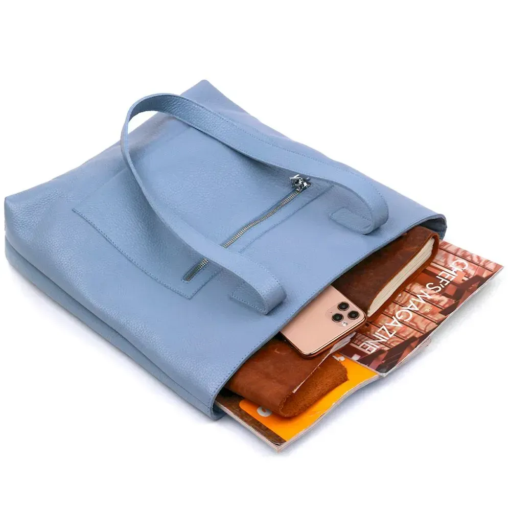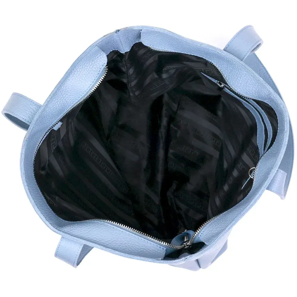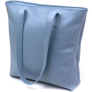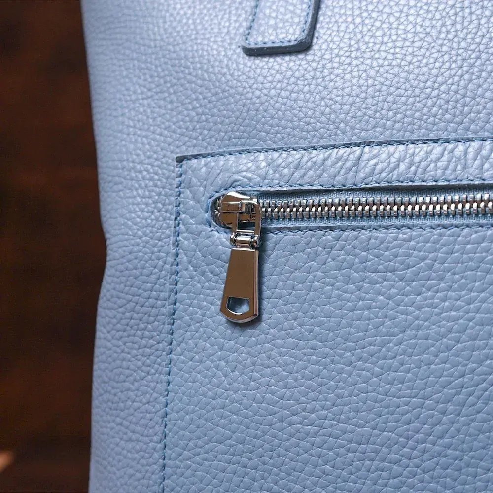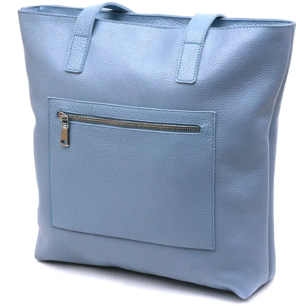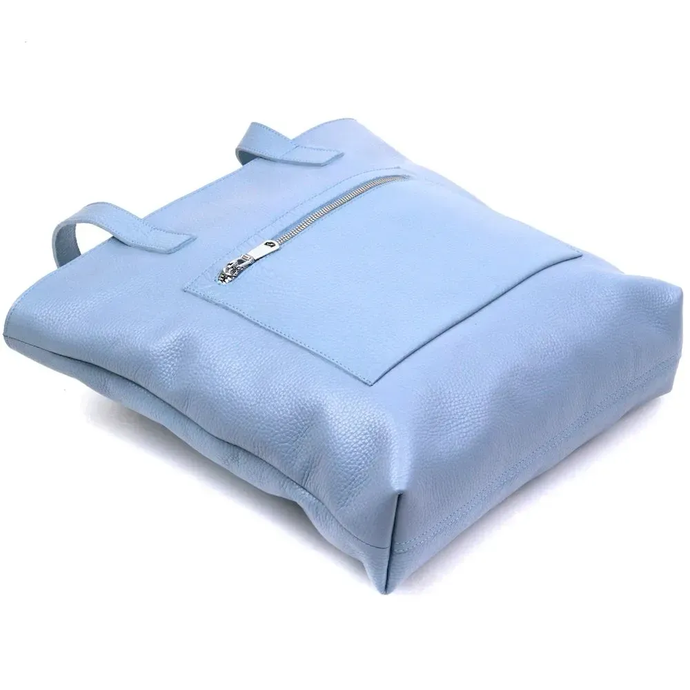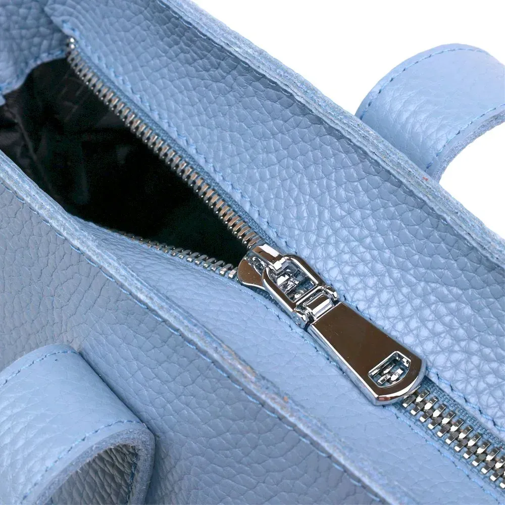 Стильная и современная женская сумка в нежном голубом цвете и зернистой фактуре. Выполнена модель из натуральной кожи, высокое качество которой Вы сразу почувствуете, как только возьмете сумку в руки. Внутри расположено одно просторное отделение с небольшим потайным карманом на молнии. На внешней стороне также есть карман на молнии.