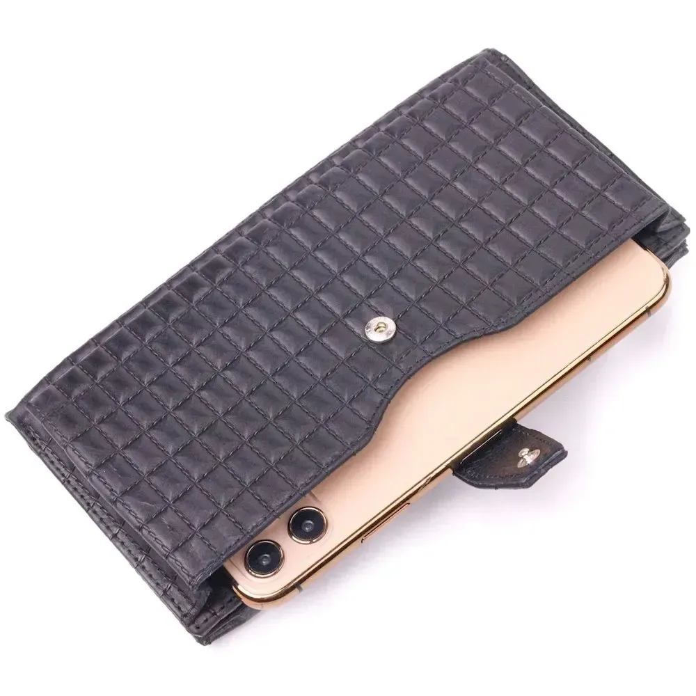 Стеганый бумажник из натуральной кожи, в классическом черном цвете. Кошелек состоит из одного глубокого отделения, четырех прилегающих карманов, двенадцати ячеек для карт, отделения под сеточкой, отделения на молнии снаружи и отделения для телефона, что закрывается хлястиком на кнопку. В изделиях этого элитного турецкого бренда всегда используются самые качественные кожаные материалы и фурнитура. Аксессуар упакован в фирменную коробочку. Кожаное изделие всегда будет прекрасным подарком для любого мужчины.