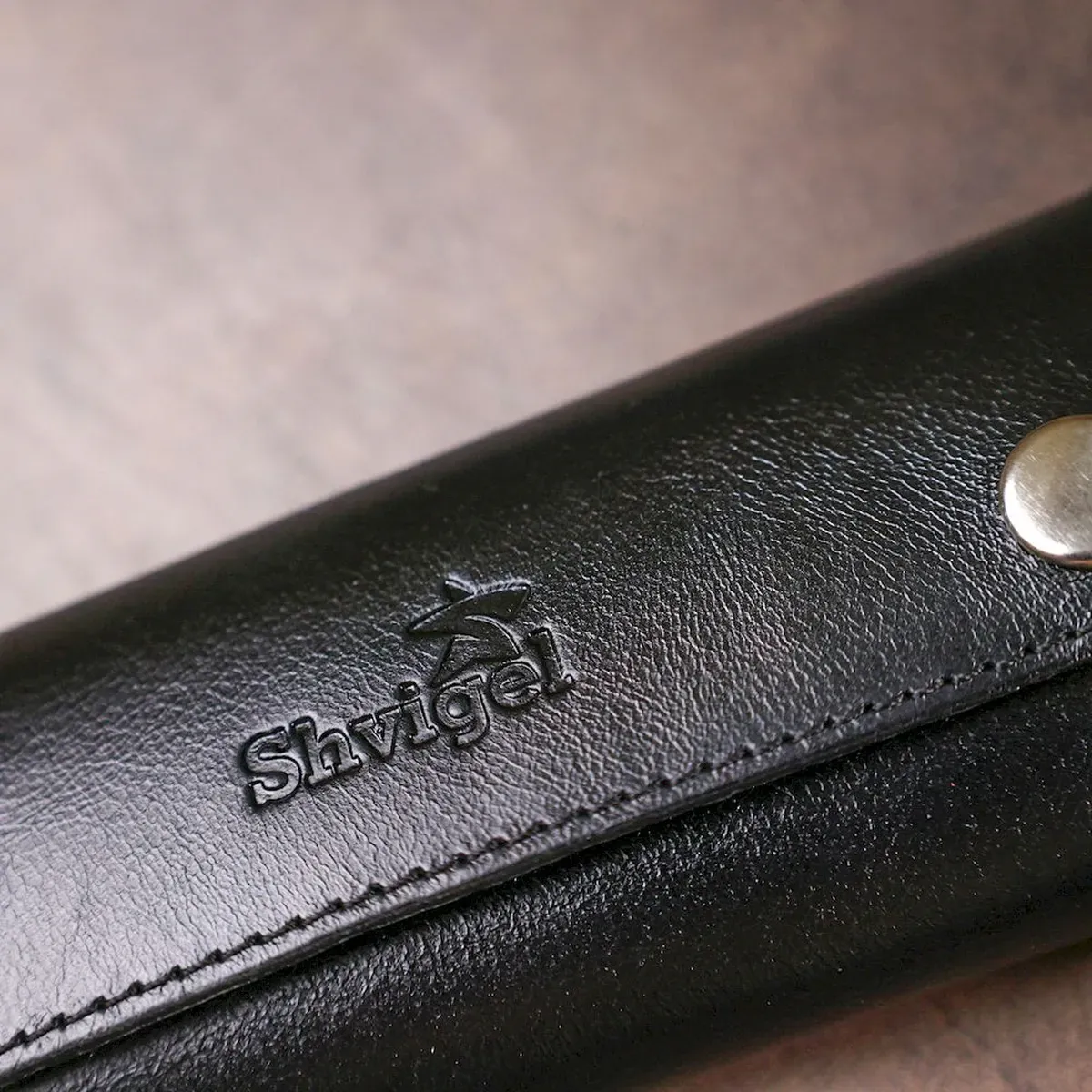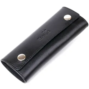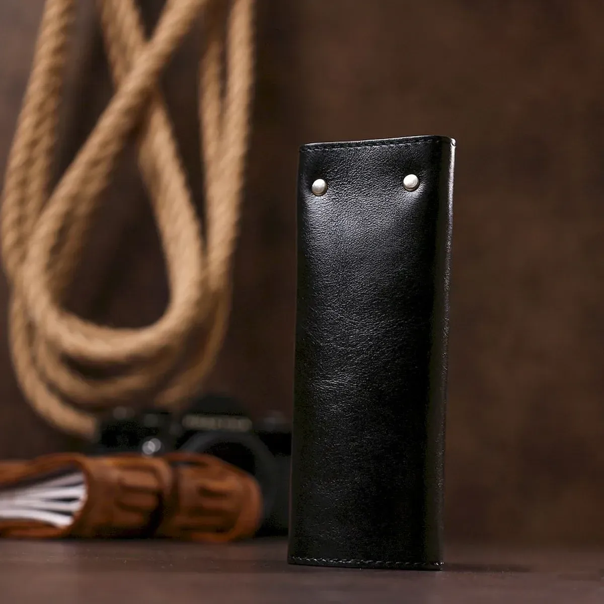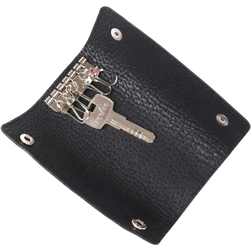 Добротная ключница из натуральной кожи от украинского производителя с отличными характеристиками износоустойчивости. Цвет изделия – универсальный черный с легким блеском, фактура – гладкая. Внутри расположены шесть небольших карабинов для ключей. Закрывается аксессуар на две кнопки в цвете под серебро.