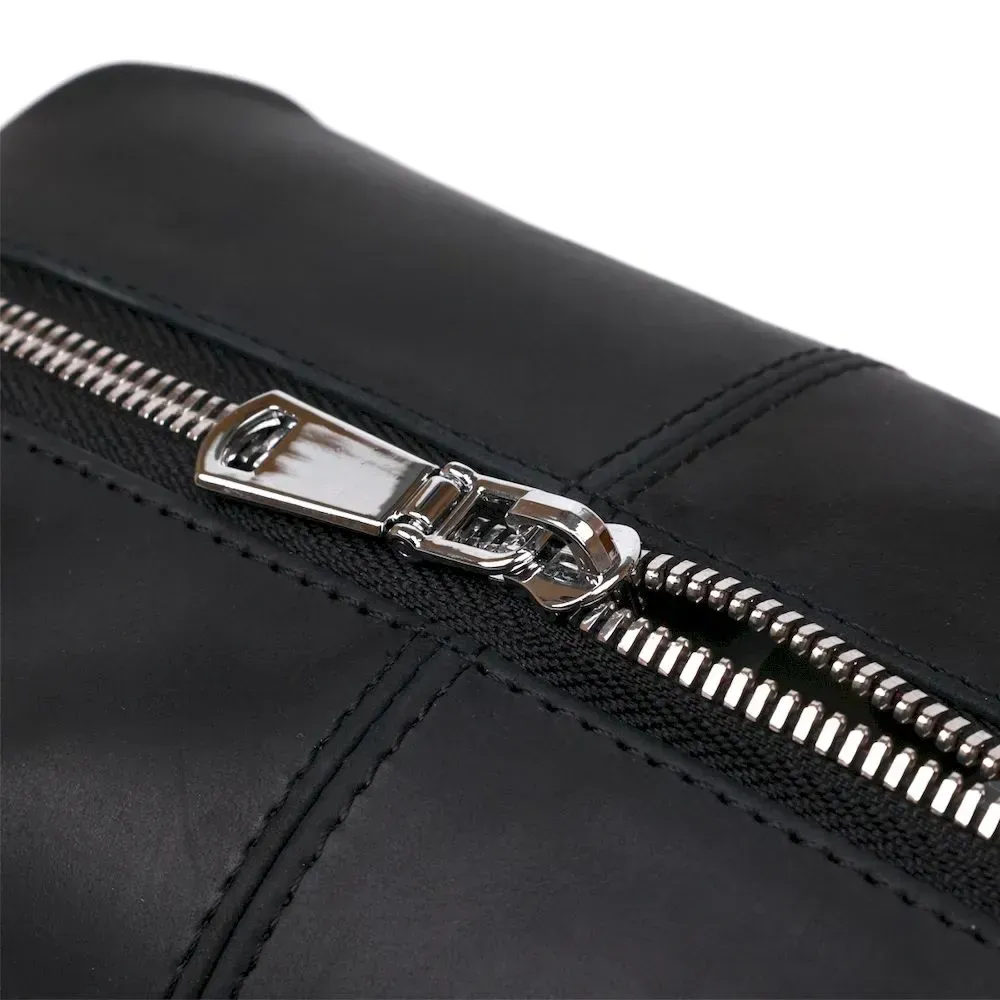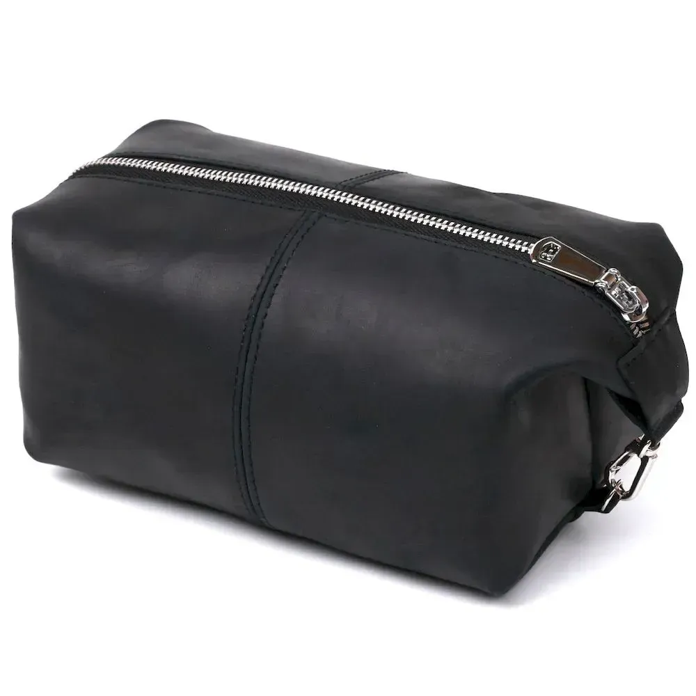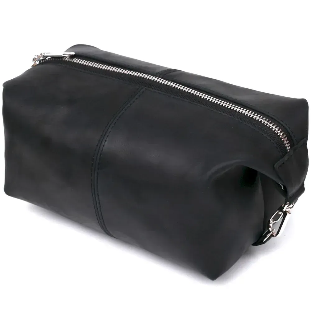 Отличная косметичка в красивом и строгом дизайне от украинского производителя. Материал изготовления – натуральная кожа высокого класса и прочности, что чувствуется сразу, как только Вы возьмёте аксессуар в руки. Данная модель имеет универсальный и практичный черный цвет и гладкую матовую фактуру. Такая косметичка станет отличным, а главное полезным подарком, дорогому человеку.