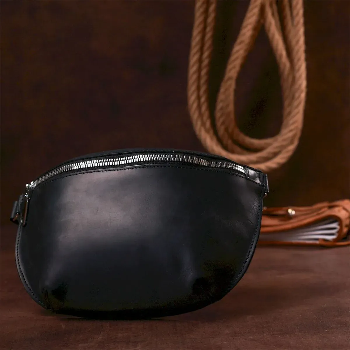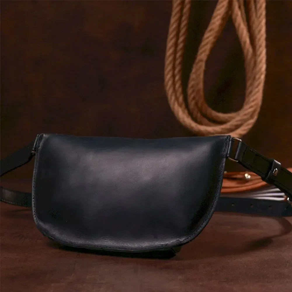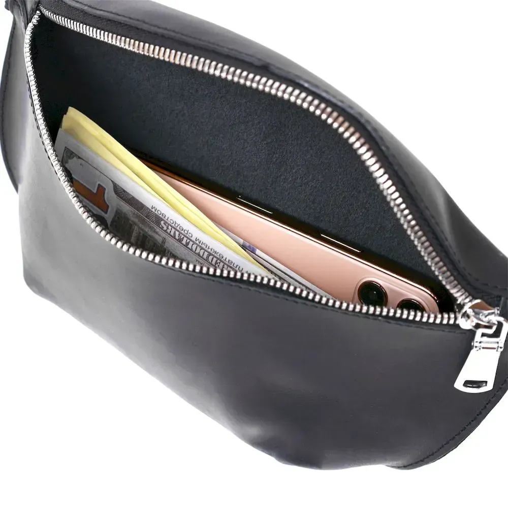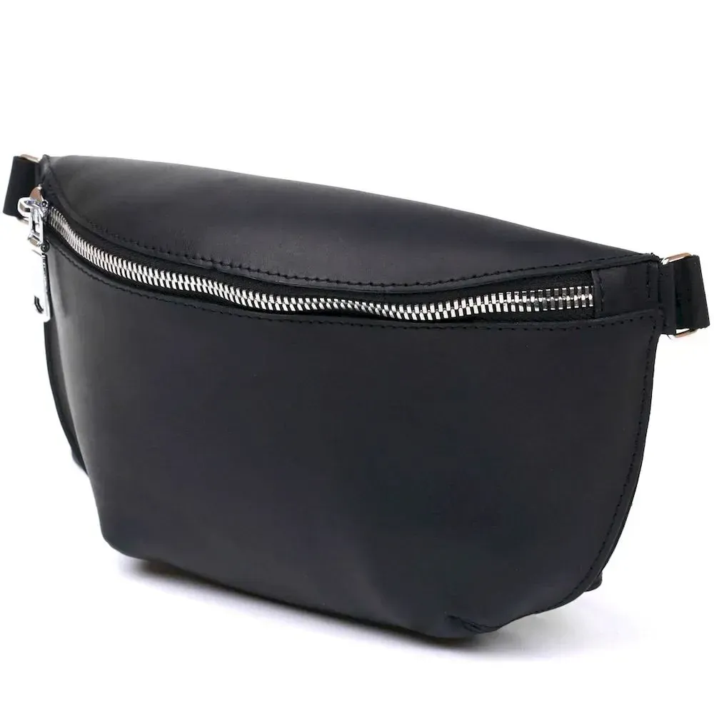Практичная женская сумка на пояс в красивом и элегантном дизайне без излишеств от украинского производителя. Материал изготовления – натуральная кожа высокого качества с отличными эксплуатационными характеристиками. Сумка имеет универсальный черный цвет и матовую гладкую фактуру. Ремень сделан также из натуральной кожи и может регулироваться по длине.