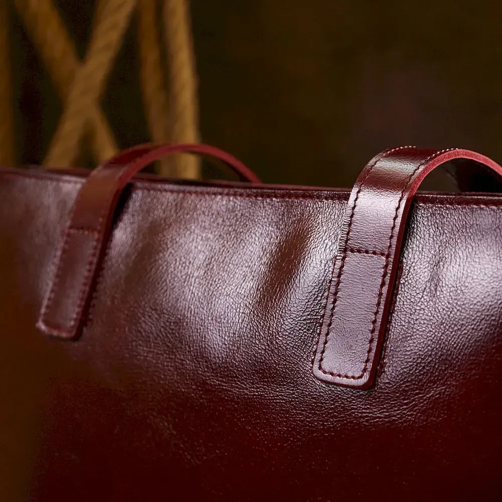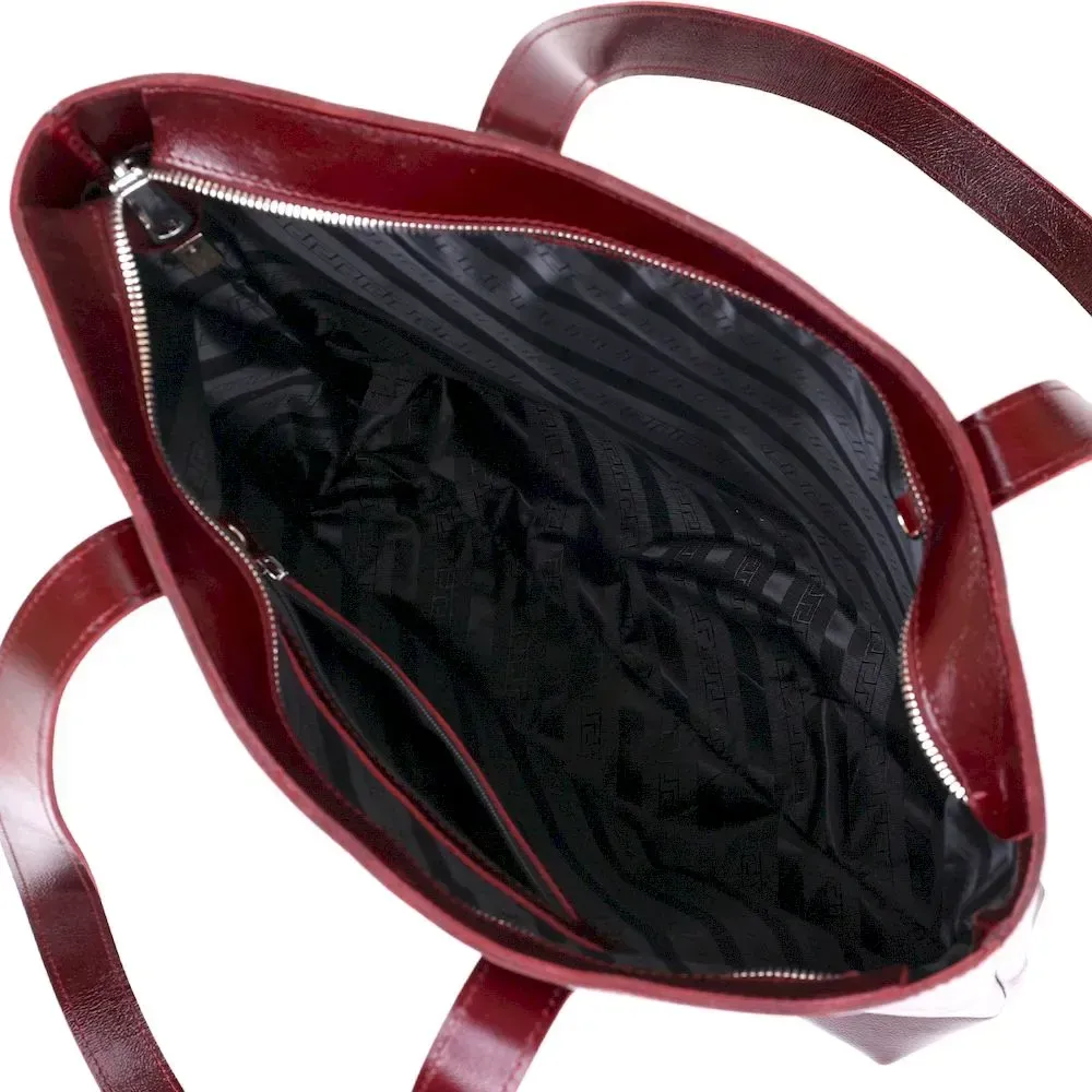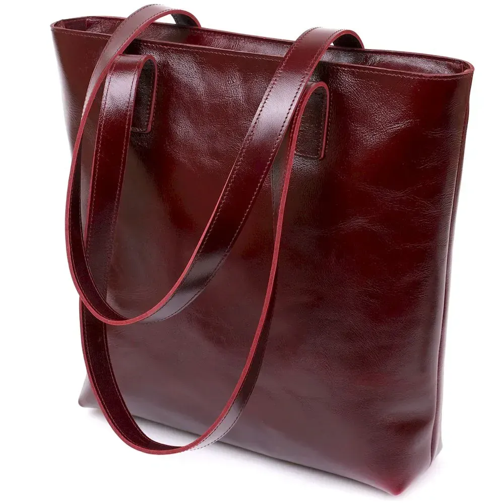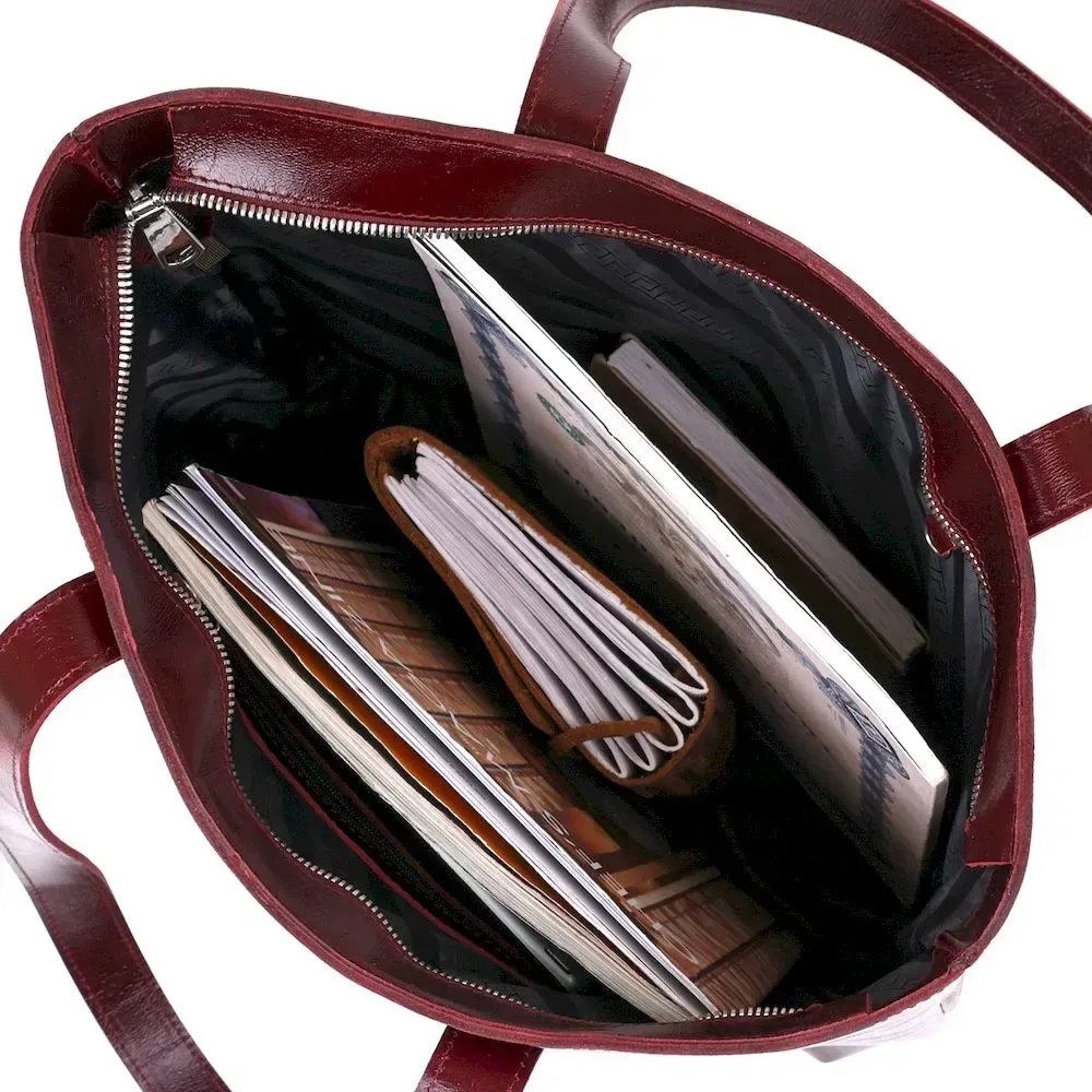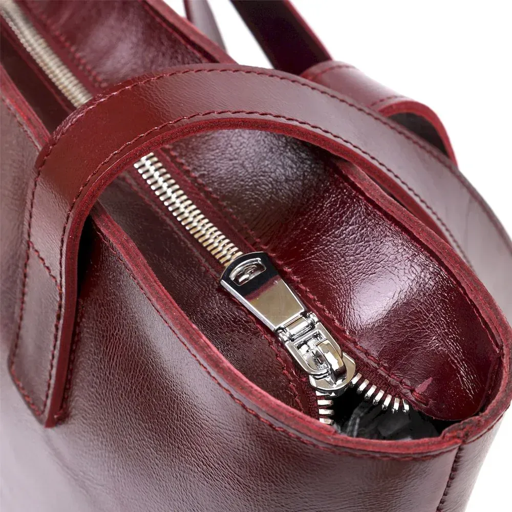 Замечательная вместительная женская сумка из плотной высококлассной натуральной кожи с отличными показателями износоустойчивости. Сумка имеет одно просторное отделение и небольшой потайной карман на молнии внутри. Закрывается также на молнию. Цвет изделия – насыщенный бордовый с легким переливом, фактура – гладкая и очень приятная на ощупь.