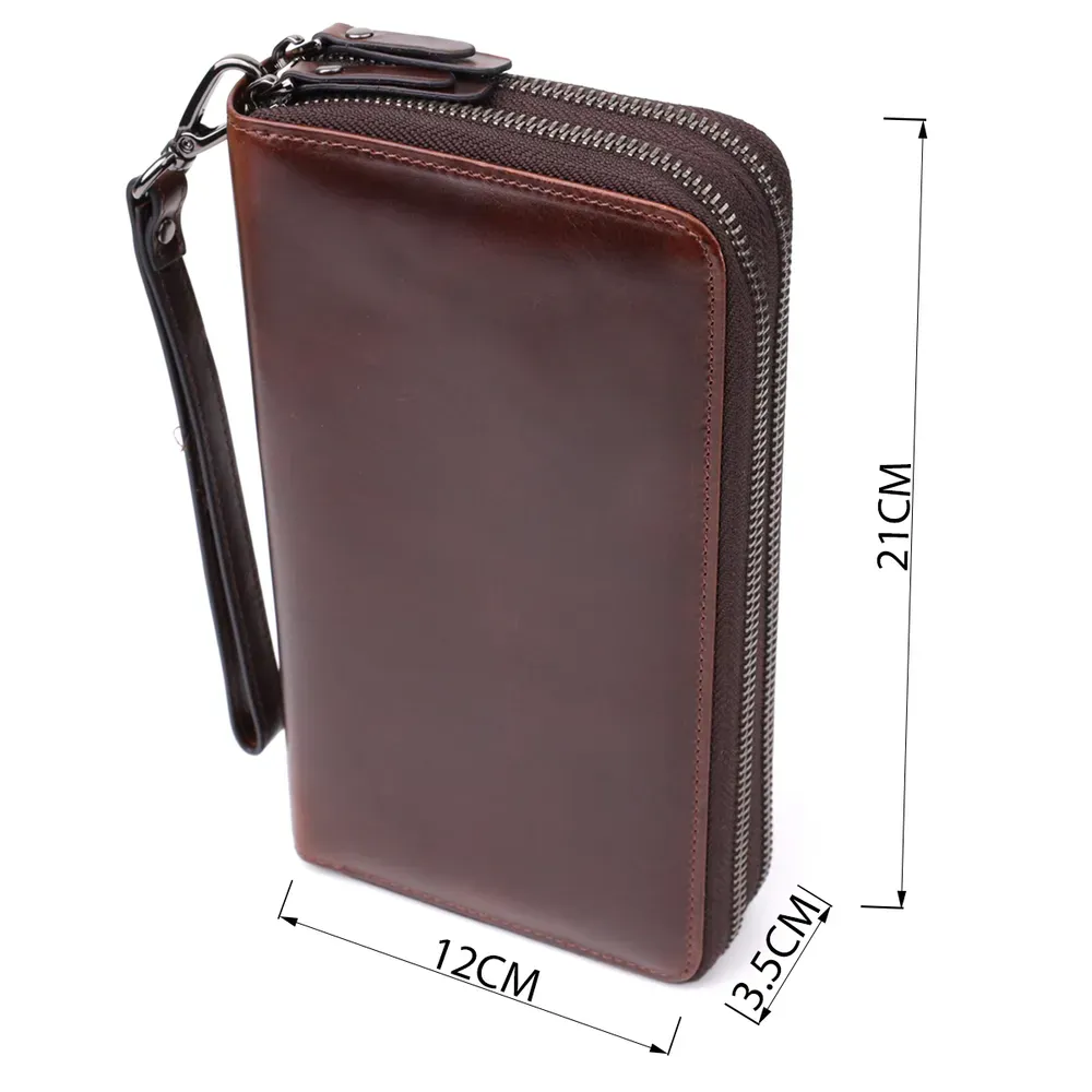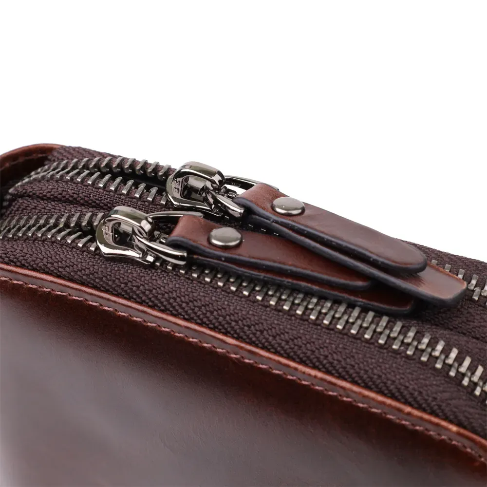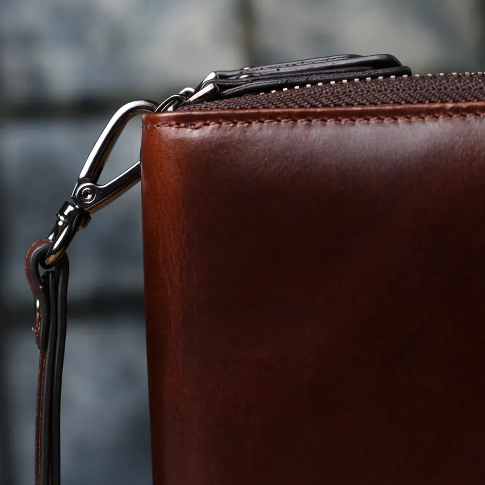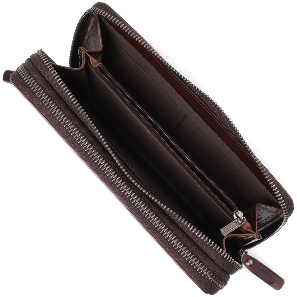 Чоловічий шкіряний клатч на два відділення у благородному коричневому кольорі виконаний з матової натуральної шкіри, яка відрізняється приємною на дотик текстурою та суворим зовнішнім виглядом. Це практичний і стильний аксесуар, що ідеально підходить для повсякденного використання або ділових зустрічей.